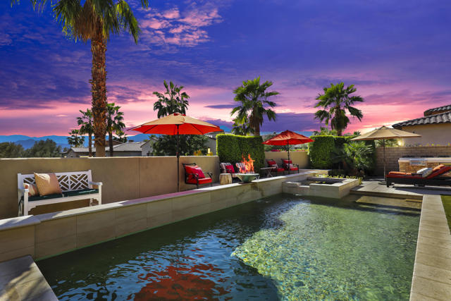FURNISHED SEASONAL RENTAL - The desert has no shortage of luxury homes, very few offer this kind of experience at this value. Hidden behind a gated street of 11 residences as part of the greater La Quinta Polo Estates, this 2.5-acre estate was designed for the rhythm of desert living: tennis in the morning, quiet afternoons by the outdoor lounge and bar, and evenings of friends and music under the mountains enjoying a sparkling pool. Guests of the home enjoy frequenting events like BNP Paribas Open, Desert Horse Park International Shows, Film festival and Thermal Race Club events. 6 Seater golf cart available for exclusive use of guests. Outdoor misters, indoor and outdoor Sonos, primary suite sauna and steam shower, 5 fireplaces, theater room, pool and spa, SW/NE Regulation Tennis court, sand volleyball court, putting green, ping pong table, outdoor bar TV area and bbq, outdoor bathroom, 4 car garage, mature landscaping, minimal neighbors, mountain views... the list goes on. Fully furnished with white linens, fully stocked kitchen. Regular maid services and concierge services available. Available May 1 through October 31 2026 for minimum 31 day stays per City of La Quinta. Rates may vary by seasons and for length of stay please inquire. Also available for sale at $3,900,000