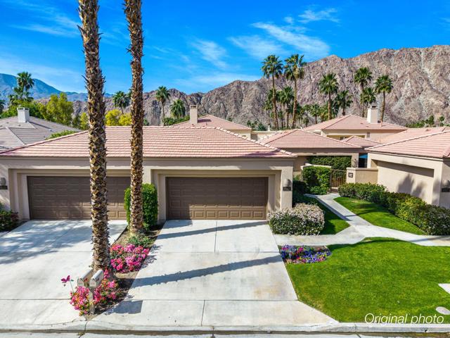Set behind the prestigious gates of Rancho La Quinta Country Club, this exceptional updated desert residence embodies elevated luxury, where timeless architecture and curated upgrades harmonize with a breathtaking natural setting. Perched above the emerald fairways of the renowned Robert Trent Jones Jr. Championship Golf Course, the home captures sweeping golf course, tranquil lake, and mountain vistas that transform beautifully from sunrise to sunset.A private courtyard arrival, framed by lush professional landscaping and ambient lighting, sets a tone of understated elegance. Chipped-edge travertine pathways lead to a custom wood entry door, opening to a light-filled interior designed for both relaxed living and sophisticated entertaining. Inside, soaring ceilings and an open-concept layout create a sense of space and flow, complemented by high-fired ceramic flooring that extends throughout. Custom interior paint and designer lighting add warmth and refinement, while the expansive family room--anchored by a bespoke entertainment wall and one of two updated fireplaces--offers an inviting gathering space.The remodeled kitchen is both stylish and functional, featuring premium Corian countertops, a custom backsplash, and beautifully refinished cabinetry. A generous center island with pendant lighting serves as the heart of the home, complemented by stainless steel appliances including double ovens, dishwasher, microwave, and refrigerator. Seamless indoor-outdoor living defines the residence. Walls of glass open to an extraordinary patio with a custom curvilinear pool, elevated spa, and cascading waterfall. A BBQ island invites effortless entertaining, while a low-profile fence preserves uninterrupted golf course views.A detached two-room casita offers flexible guest accommodations, while the main home showcases quality finishes throughout, including raised panel solid core doors, custom shutters, tailored shades, and new LED lighting. Additional highlights include two updated fireplaces, extensive system upgrades, and a finished two-car garage with epoxy flooring, air conditioning, and built-in storage. Please see Improvements List.This refined desert sanctuary offers privacy, panoramic beauty, and an exceptional lifestyle in one of La Quinta's most coveted communities.