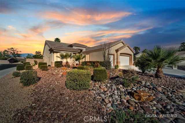 Sun City Palm Desert - Cayman. Ideally located near the Lakeview Recreation Center and pool, this popular greatroom home offers 2 bedrooms, 2 bathrooms, and a versatile den that can serve as an office or formal dining room. The south-facing rear yard is a private retreat with an extended stamped concrete and flagstone patio, alumawood patio cover, and no homes behind--providing open space and mountain views. The home exudes curb appeal with dramatic desert landscaping, stamped concrete hardscape, glass front doors, and an updated paint scheme. Inside, diagonally laid tile flows throughout, creating a clean, cohesive look. The greatroom features a custom built-in media center and cabinetry, while the kitchen is appointed with slab granite countertops, an island with breakfast bar, and ample workspace. The den opens to the front courtyard through elegant French doors, offering a seamless indoor-outdoor connection. The primary suite includes direct access to the rear patio, a walk-in closet with mirrored wardrobe doors, and an en-suite bath with a sitting vanity and shower/tub combination. The guest bedroom is enhanced with custom built-in shelving and a desk, and the guest bathroom includes a stall shower. Additional features include a laundry room with built-in storage and a spacious 2-car garage with extensive cabinetry. This home combines comfort, functionality, and location--perfect for enjoying the desert lifestyle.