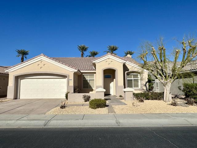 Sophisticated Desert Living with Breathtaking Mountain Views. Discover elevated living in this exquisitely upgraded Cortona Plan 2, nestled within the prestigious 55+ community of Villa Portofino in Palm Desert. Perfectly positioned to capture stunning mountain vistas and natural light, this sought-after floorplan seamlessly blends refined design with effortless comfort. From the moment you enter, high-end finishes make a statement - solid core doors, wide plank floating floors, elegant custom tilework, and bespoke window treatments set the tone for luxury throughout. Dramatic tray ceilings enhance the airy ambiance in the expansive living and dining areas, creating a grand yet welcoming atmosphere. The recently upgraded kitchen is a chef's delight, showcasing 42" upper cabinets, a Whirlpool stainless appliance suite, striking matte black hardware, quartz countertops, and a sleek tile backsplash with bar seating for casual dining. An inviting den, complete with an illuminated built-in wet bar and display curio, offers versatile space for an office, media lounge, or serene yoga retreat. The generously sized guest bedroom is ideally situated for privacy, with direct access to a beautifully appointed secondary bath featuring granite counters and a walk-in shower. The luxurious primary suite is a sanctuary unto itself, offering panoramic mountain views, an upscale ceiling fan, tray ceiling detail, and a spa-inspired ensuite with both a soaking tub and walk-in shower. A spacious walk-in closet with custom built-ins adds function to the elegance. Step outside to the covered patio easily accessed from both the primary suite and living area - where you'll enjoy expansive mountain views and plenty of space for outdoor dining or lounging in style. Convenience meets sophistication with both elevator and stair access, and the home is just moments from the expansive clubhouse. Enjoy world-class amenities including a private movie theater, full-service restaurant and bar, Olympic-sized pool, spa, a fitness center, yoga studio, 9-hole putting green, dog run, and an endless array of social and recreational activities. Located near premier shopping, dining, and entertainment, Villa Portofino offers not just a home, but a vibrant lifestyle. HOA dues include gated security, cable, internet, water, trash, insurance, roof maintenance, and all common area upkeep for true peace of mind.