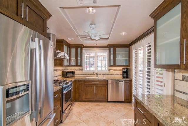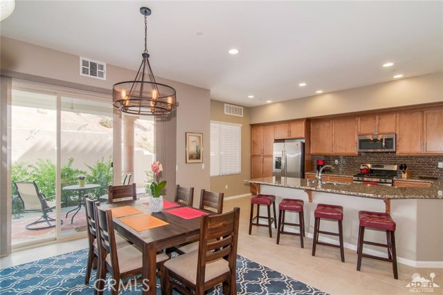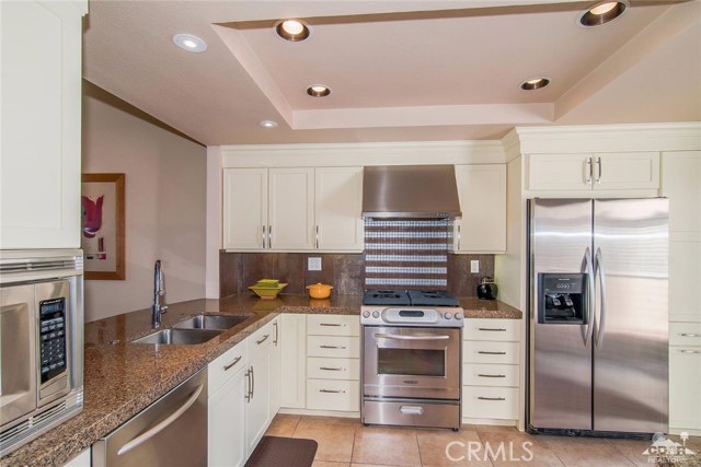 Villa Portofino is a 55+ Active life style gated community centrally located in desirable Palm Desert,Ca. This 2 Bedroom/ 2 Bathroom includes a dedicated office space. The upgraded unit features soaring 10 ft. ceilings, custom lighting, custom interior paint, custom Hunter Douglas Skyline Gliding window panels with blackout shades in bedroom plus premium tile flooring and carpet. The tandem 2 car expanded garage is attached and has epoxy garage flooring. Comstock Homes built this unit in 2015 as part of a green development which includes solar panels on the roof. The HOA includes water, sewer, trash, pest control, upgraded cable, high speed internet, building insurance and window washing. The Clubhouse features a restaurant, exercise and yoga classes, free movies in the theater and a junior Olympic salt water pool. The community sponsors cooking classes, athletic events, silver sneakers classes and lively bingo games Thursday nights at the Bistro with a new chef the owners rave about!