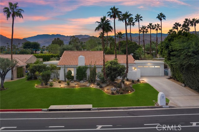 55+ Sun City Palm Desert. Del Webb's 'Best Bang for your Buck' active retirement community in the desert. Spectacular peek-a-boo golf course and mountain views!! Super low HOA dues, golf courses, pools, fitness centers, tennis, pickle ball etc. This popular 2 bedroom/2 bathroom Gorham model is located near the Mountain View Clubhouse, close to the dog park and walking area. The home features wood-like' porcelain tile throughout, high ceilings, transom windows for extra natural light, special architectural details. Upgrades include motorized remote control drop shades on patio, new furnace and AC coil and control board, landscape lighting in front and back, new water heater, new kitchen appliances, interior and exterior paint, master bedroom and bath remodel, patio extension, and garage mini-split. The beautiful curb appeal has easy maintenance desert landscaping and lighting. Inside, the remodeled kitchen features quartz counters with glass tile backsplash, white cabinets with hardware, extra pantry with plenty of storage, newer appliances and gas cooktop, recessed lighting and amazing skylight, and eat in breakfast bar and dining area with sliding door to the patio. The custom mirrored wall expands the views in every direction! The living room has a custom wall and built-in media cabinet, upgraded fan/light combo and views to the patio. The master suite has upgraded fan/light, vertical blinds, closet #1 with 2-level design, window with a view, full bath includes quartz counter, double vanity, custom tile shower with frameless glass shower enclosure and decorative tile, new toilet, upper LED lighting, and closet #2 with 2-level design. The guest bedroom and bath are on the opposite side of the home for maximum privacy, bath is has upgraded quartz counter and cabinet and glass surround at the tub/shower. The laundry was moved to the garage opening the space to a small office/hobby room and storage area. The garage has washer and dryer and a new mini-split AC and built-ins. Now for the BEST PART!!! The serenity of the private backyard with stunning landscape lighting and multiple seating and dining areas complete with peek-a-boo mountain and golf course views and the tranquil sounds of the fountain. This home is perfect for entertaining family and friends for the holidays or simply relaxing with a cold beverage after a day on the golf course or tennis courts. 'Buy Where you Love to Play...Sun City Pal