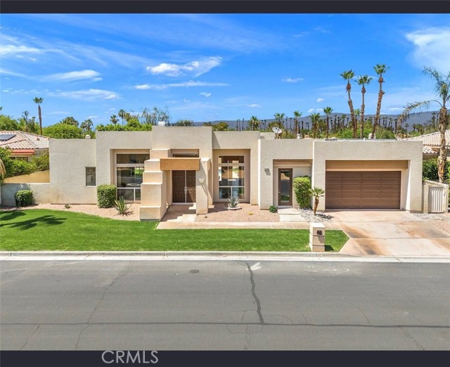 Set in the heart of Palm Desert, this striking newly constructed contemporary residence offers the perfect balance of refined design, modern comfort, and resort-style living. Privately gated and thoughtfully designed, this 4-bedroom, 3-bathroom home invites you to enjoy sweeping views, a sense of privacy, and the kind of seamless indoor-outdoor lifestyle the desert is known for.From the moment you enter through the dramatic 10-foot double doors, you're welcomed into a bright, open interior designed for both everyday living and elevated entertaining. Engineered hardwood flooring, custom interior doors, a sleek smart electric fireplace, and curated black and gold fixtures and hardware create a clean, sophisticated aesthetic throughout.At the center of the home, the open-concept kitchen is made to gather in whether you're hosting friends for cocktails or enjoying a quiet morning at home. It features custom cabinetry, quartz countertops, a dramatic waterfall island, pot filler, premium KitchenAid stainless steel appliances, and a stylish bar area with wine refrigerator.The layout includes three secondary bedrooms plus a spacious primary suite with a walk-in closet and a spa-inspired ensuite bath featuring dual sinks, a soaking tub, and a walk-in shower overlooking the lush yard. Additional bathrooms showcase striking stone and porcelain finishes and smart toilets, blending design with modern convenience.Outside, the home truly shines as a private desert retreat. Enjoy a heated pool and jacuzzi, with space to relax, unwind, and entertain with ease. Whether it's a weekend gathering, sunset dinner, or poolside afternoon, this home is designed to make hosting feel effortless.Additional highlights include smooth Santa Barbara-style stucco, new copper plumbing, new gas line, new electrical, new sewer, central air and heating, and a 2-car garage with deep epoxy flooring and an aluminum glass garage door.Ideally located in central Palm Desert, this home offers convenient access to the area's top dining, shopping, golf, entertainment, and everyday amenities placing you close to everything while still enjoying a private, polished retreat.