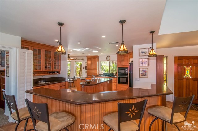 South Palm Desert living at its finest! New Price !Architecturally stunning home located in the Canyon Cove neighborhood on an over-sized lot with panoramic mountain vistas and plenty of storage space. The warmth of the entrance and stunning high ceilings as you enter, open to a large entertainment great room with fireplace. The eat-in kitchen is totally remodeled with premium gas range, modern cabinets, quartz counter tops and separate pantry. This charming and sophisticated home features 3 bedrooms, 2 remodeled over-sized bathrooms and a remodeled powder room, as well as a separate office and a laundry room. The spacious backyard includes pool/spa and patio area featuring breathtaking mountain views. Must see to appreciate. Canyon Cove includes a community salt water pool, spa, two tennis courts, two pickle courts, all with with very low HOA dues.