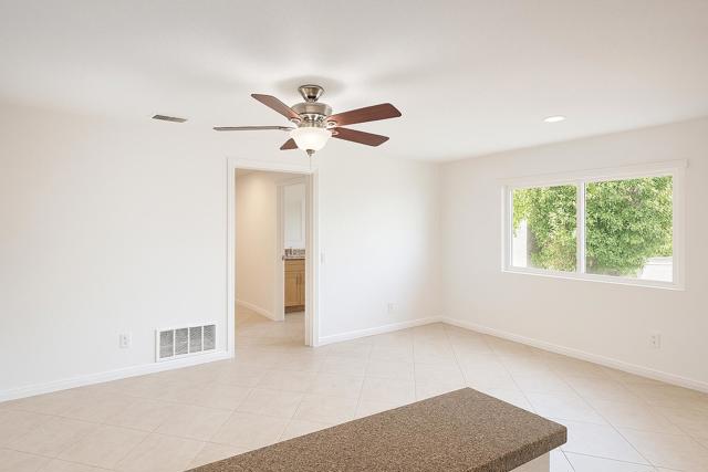 Located on a corner lot in the scenic La Quinta Cove, this beautifully 3-bedroom, 2-bath home blends comfort, style, and convenience. Double doors welcome you into a ceramic-tiled entryway, flowing into a cozy living room with carpeting, crown molding, a striking stone fireplace, and elegant wainscoting. The spacious dining area has sliding door access to a private, serene back patio. The sunlit kitchen boasts Corian countertops, stainless steel appliances, custom cabinetry, and track lighting for a modern flair. Retreat to the primary suite featuring warm wood floors, a built-in walk-in closet, and patio sliders that open to your peaceful outdoor escape. Both bathrooms offer stone countertops, and custom-tiled shower stalls. Two additional bedrooms include wood flooring, ceiling fans, and generous closets. Additional highlights include energy-efficient windows and sliding doors, updated lighting and ceiling fans, and a finished two-car garage with epoxy flooring. All just minutes from hiking trails, golf, tennis, shopping, dining, theaters, and more.