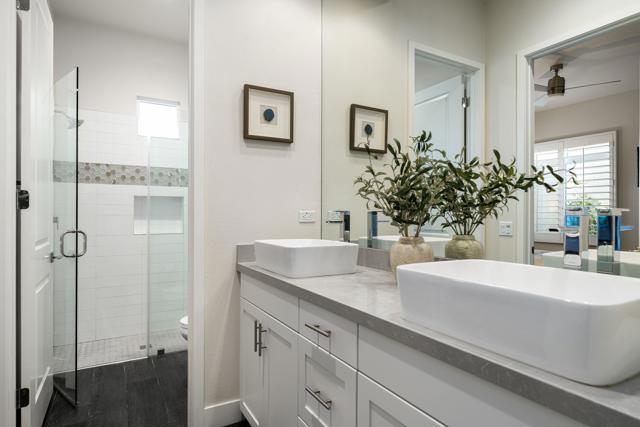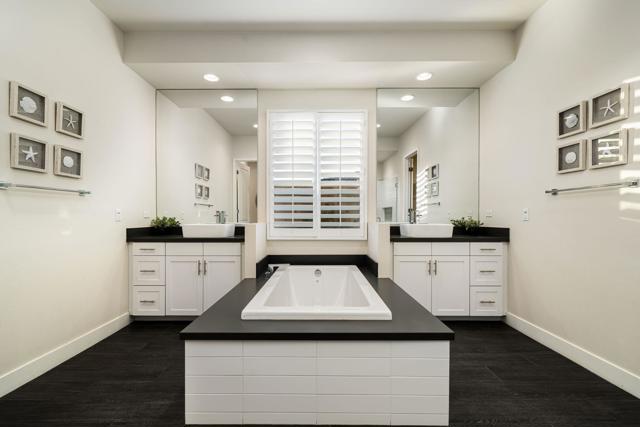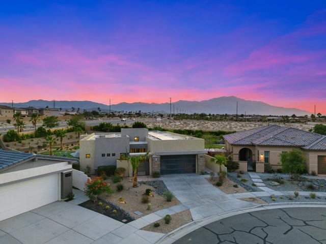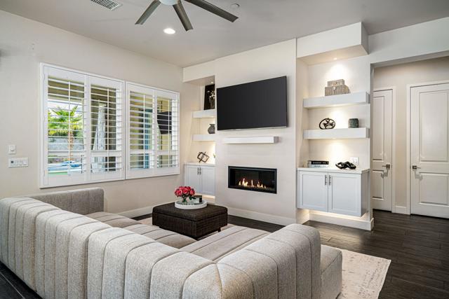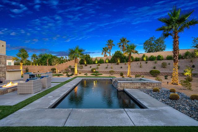 Tesla Collection Plan 3 residence (2018) is distinguished by its contemporary design and premier location on the largest available lot, encompassing 17,424 square feet resort outdoor living . This home features 3 BEDROOMS + DEN/ OFFICE/ 4TH BEDROOM, 3 BATHROOMS and OWNED SOLAR: exceptional property that provides expansive environment for outdoor enjoyment.The home offers a resort-style backyard meticulously designed for outdoor living and entertaining. The exterior amenities include a swimming pool, a spa enhanced with a cascading water feature, an outdoor BBQ area, a bricked gas fireplace, a unique over-water golf hole, a two-tier putting green, a bocce ball court, and a dedicated outdoor workout space . A covered balcony equipped with a grill, counters, and seating further enhances the outdoor experience.The interior of the residence showcases numerous upgrades, such as elegant glass cabinetry and doors, sophisticated recessed ceilings and lighting, soffits, exterior sliders, under-lit floating cabinets, a fireplace, integrated ceiling speakers, ceramic tile flooring, and plantation shutters throughout. The entryway features stunning high ceilings, complemented by 10-foot ceilings throughout the remainder of the home. The open living area is designed with sliding glass doors that create a seamless transition to the outdoor living space. The property also includes a finished, air-conditioned garage with an epoxy floor and built-in shelving. Furthermore, the home has 37 OWNED invisible SOLAR PANELS and features a modern flat roof design.Conveniently situated within the secured Genesis gated community, off Gerald Ford between Cook and Portola, residents benefit from swing arm and RFID tag-activated gates, two dog parks, an open play area, a community gym, pool, hot tub, and an outdoor grill and dining area. The community is managed by an active board and HOA that diligently upholds community standards.The location offers excellent access to I-10, key arterial roads, and is just 11 miles from Palm Springs airport. Additionally, the planned adjacent 27-acre Millennium Park and numerous amenities within 1.5 miles, including gyms, hotels, restaurants, a private High School, a former-PGA tour public golf course, and a minor league hockey arena, add to the desirability of this location. With 250 sun-filled days per year and an average daily temperature of 73.1 degrees, This Palm Desert location offers an ideal lifestyle.