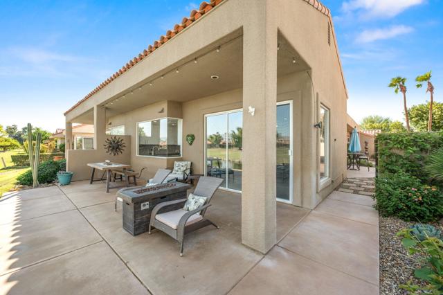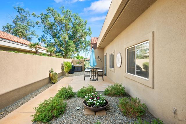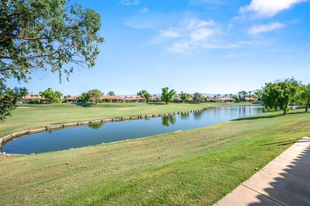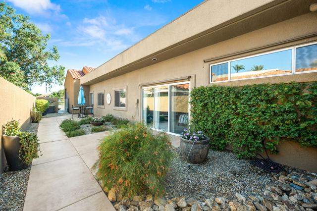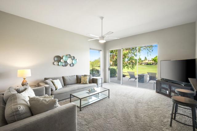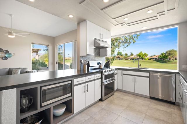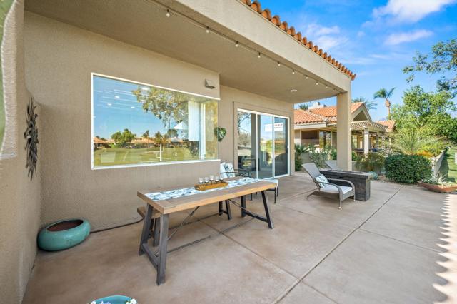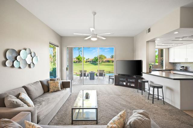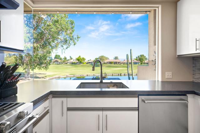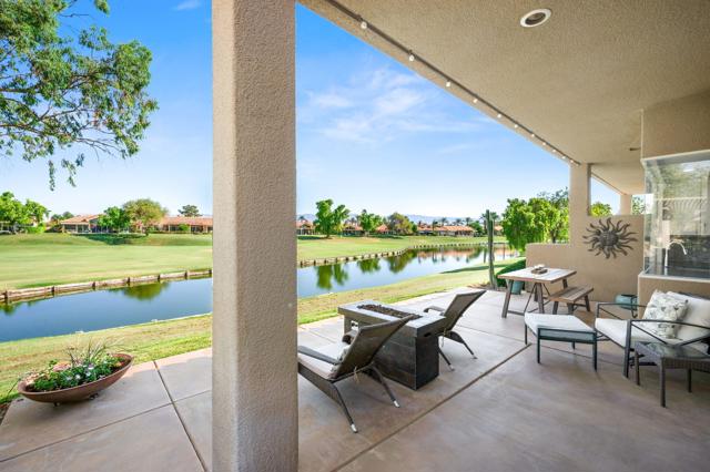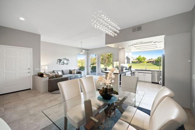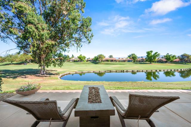 Experience the Desert Lifestyle at its best in this impeccable home in guard-gated Mission Hills. With tasteful contemporary updates and decor, this stunning 1620 SF, 2 BR PLUS Den, 2 BA home is sold furnished. NO land lease-you own the land. Enter through a gated, inviting private courtyard, and enter the Great Room where you are greeted with expansive views of the 5th Fairway and Lake on the Westin Pete Dye Course. The Great Room has an open layout with the kitchen and dining room, perfect for family gatherings and entertaining. The light-filled, updated kitchen has large windows showcasing the amazing views. The cook of the family will love the stainless appliances, including gas range with double ovens. Abundant cabinets and quartz countertops offer ample workspace. Plus a separate pantry. Stunning dining room with contemporary chandelier gives a warm ambiance to gatherings. Great room sliders open to the updated, outdoor patio complete with propane table firepit. A great spot for entertaining, drinking your morning coffee or a cocktail in the evening enjoying the amazing golf course, mountain views and sunsets. Primary bedroom is large with ample closet space and has sliders that open to the private courtyard. Spacious, updated primary bath has a large shower and contemporary tile accents. Your guests will enjoy the cozy guest bedroom. The den offers a variety of uses and can accommodate a sleeper sofa. Sold furnished per Inventory List including outdoor furniture. All appliances have been updated along with A/C Heating, Tankless Gas Water Heater, and new Garage Doors. Home has a monitored security system and doorbell camera. 2 car garage, PLUS an additional golf cart stall. HOA covers the guard gated security, roof and exterior maintenance, common area grounds, cable, internet, trash and community pools and spas. Mission Hills CC memberships are available for social, sports activities and golf. The nearby Westin also offers social, sports & Golf Palm Club Memberships. Convenient location just minutes from Palm Springs Airport, Eisenhower Medical Center, Restaurants and El Paseo shopping. Great Opportunity to make this your Desert Retreat!