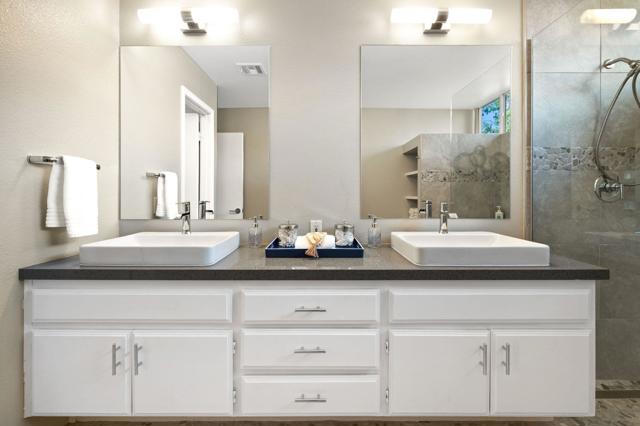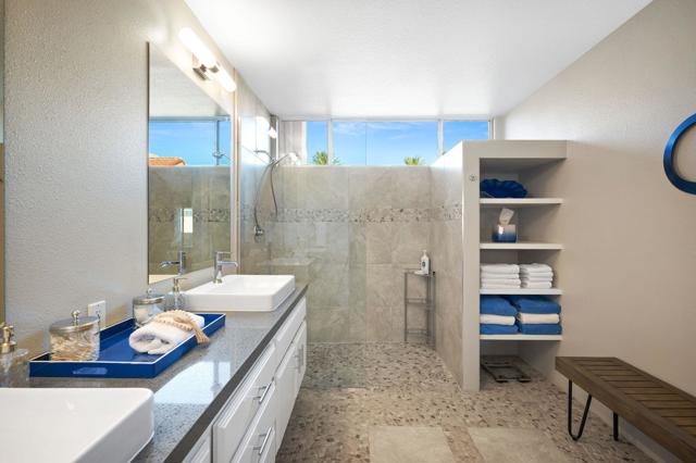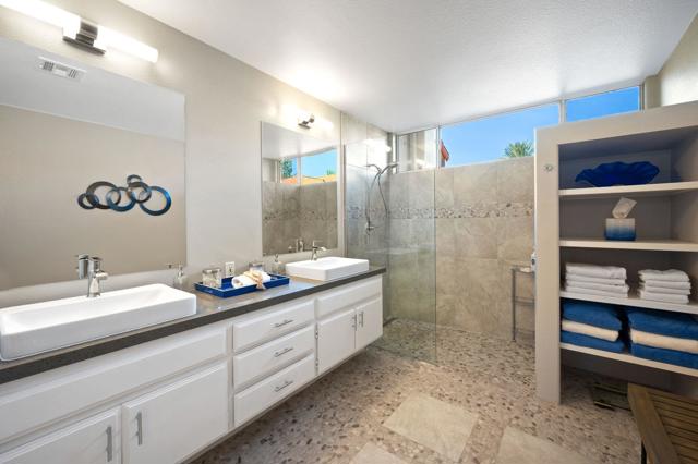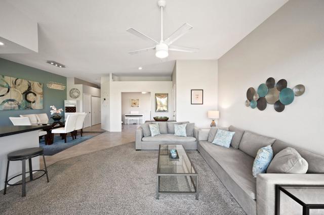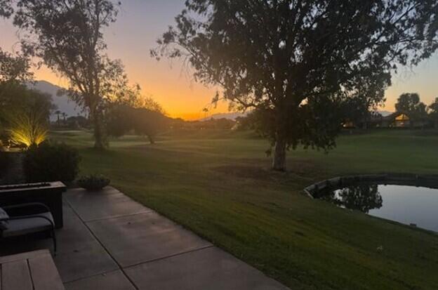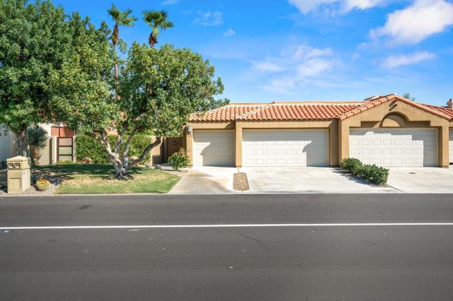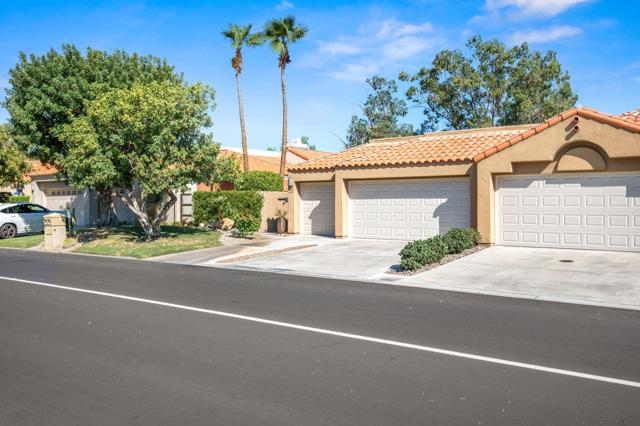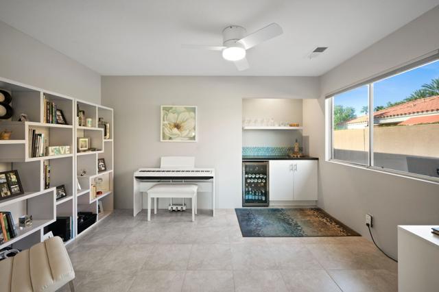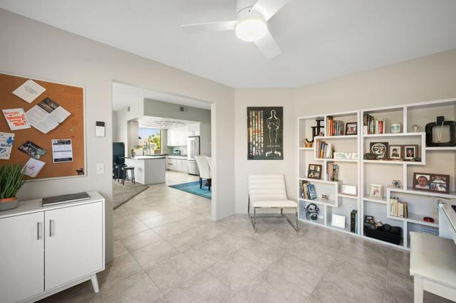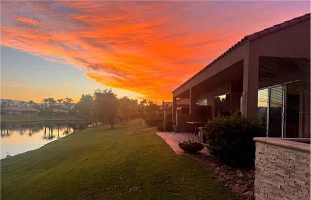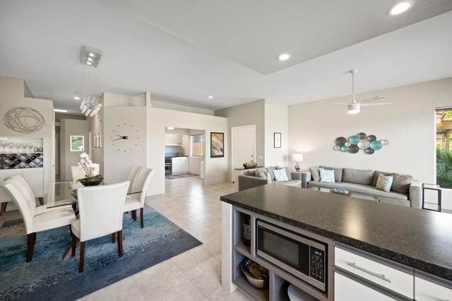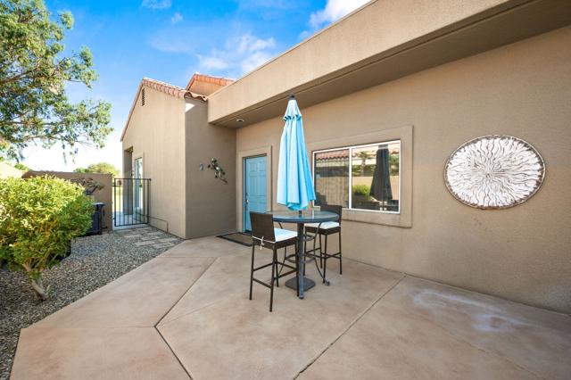 Experience the Desert Lifestyle at its best in this impeccable home in guard-gated Mission Hills. With tasteful contemporary updates and decor, this stunning 1620 SF, 2 BR PLUS Den, 2 BA home is sold furnished. NO land lease-you own the land. Enter through a gated, inviting private courtyard, and enter the Great Room where you are greeted with expansive views of the 5th Fairway and Lake on the Westin Pete Dye Course. The Great Room has an open layout with the kitchen and dining room, perfect for family gatherings and entertaining. The light-filled, updated kitchen has large windows showcasing the amazing views. The cook of the family will love the stainless appliances, including gas range with double ovens. Abundant cabinets and quartz countertops offer ample workspace. Plus a separate pantry. Stunning dining room with contemporary chandelier gives a warm ambiance to gatherings. Great room sliders open to the updated, outdoor patio complete with propane table firepit. A great spot for entertaining, drinking your morning coffee or a cocktail in the evening enjoying the amazing golf course, mountain views and sunsets. Primary bedroom is large with ample closet space and has sliders that open to the private courtyard. Spacious, updated primary bath has a large shower and contemporary tile accents. Your guests will enjoy the cozy guest bedroom. The den offers a variety of uses and can accommodate a sleeper sofa. Sold furnished per Inventory List including outdoor furniture. All appliances have been updated along with A/C Heating, Tankless Gas Water Heater, and new Garage Doors. Home has a monitored security system and doorbell camera. 2 car garage, PLUS an additional golf cart stall. HOA covers the guard gated security, roof and exterior maintenance, common area grounds, cable, internet, trash and community pools and spas. Mission Hills CC memberships are available for social, sports activities and golf. The nearby Westin also offers social, sports & Golf Palm Club Memberships. Convenient location just minutes from Palm Springs Airport, Eisenhower Medical Center, Restaurants and El Paseo shopping. Great Opportunity to make this your Desert Retreat!