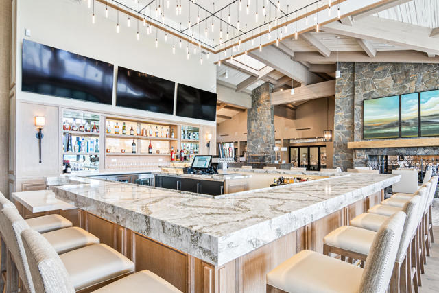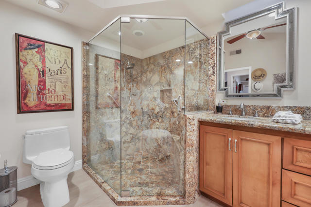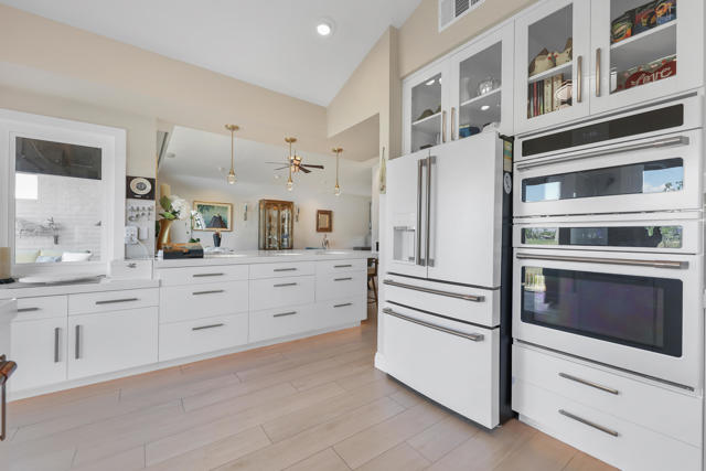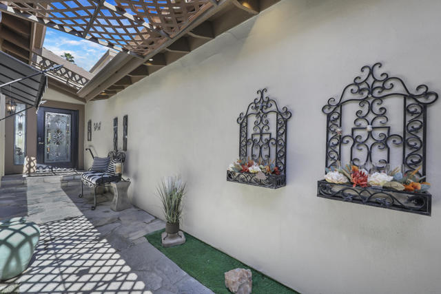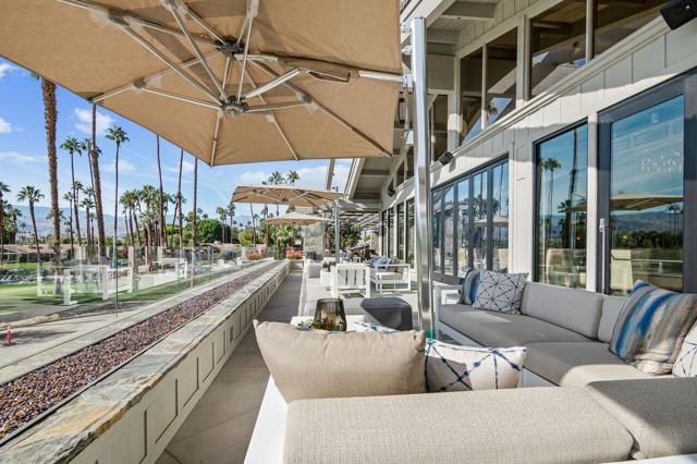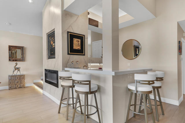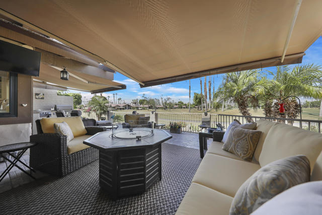 Stunningly remodeled 2BD + den, 3.5 BA Laramie model in The Lakes CC with 2,184 sq ft of luxury living! This beautiful home also has SOLAR to reduce those energy bills. New Bosch AC/ Heating and a new hot water heater in 2023. Enjoy breathtaking mountain, fairway & clubhouse views from the extended tiled patio with built-in BBQ, side burner, misting system & electric awnings. Interior features include a sleek electric linear fireplace, wet bar w/ wine cooler, 2 inch quartz counters and 5 matching bar stools, new dual paned windows (MILGARD) with electric shades, and Italian wood-look tile throughout. Wall removed between kitchen/living for open layout w/ 2 inch quartz counter top island & matching barstools. Kitchen boasts high end GE Cafe appliances, glass backsplash, & custom cabinetry. Under cabinet lighting and toe kick lighting. All baths remodeled w/raised cabinets and granite counters & shower surrounds. Den w/ French doors leads to built-out office, with outstanding storage. Bedrooms have wood shutters. Garage has plenty of cabinets, interlocking paver drive/walkway, courtyard with custom wrought iron gate. Offered partial furnished + golf cart included (Caddy Shack). Enjoy 27 holes of golf, 9 pickleball courts, tennis, bocce, fitness center & a world-class clubhouse in this guard-gated community! No expense has been spared on this move-in ready home .