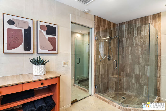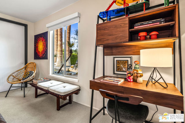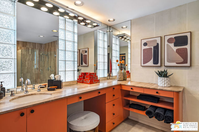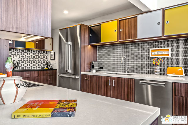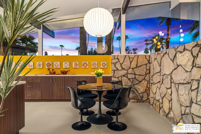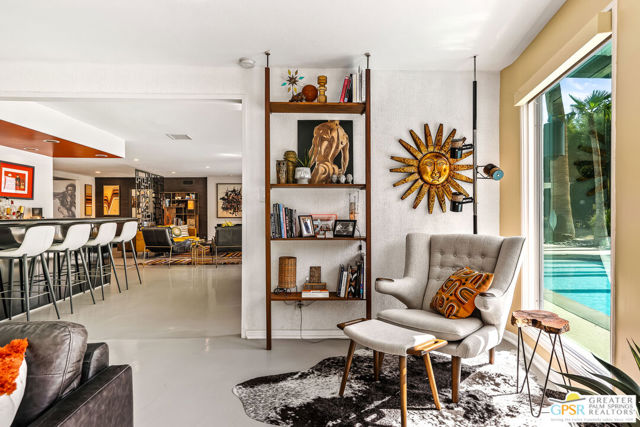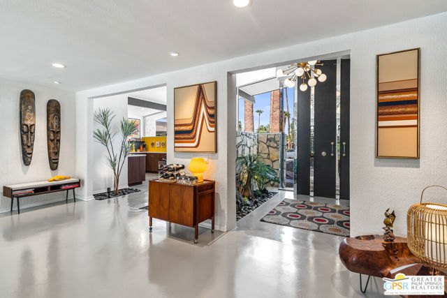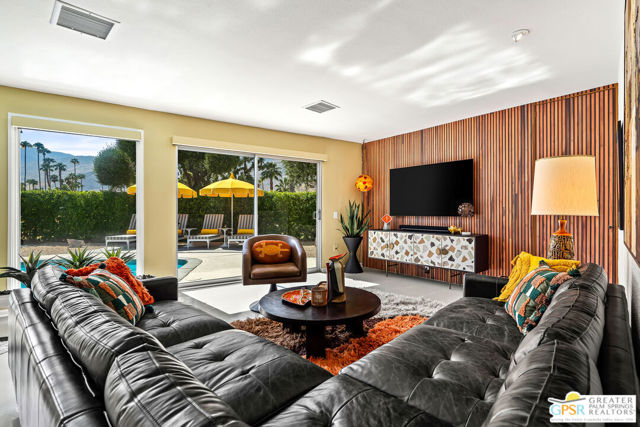 Recently featured in Palm Springs Life Magazine and The New York Times, and chosen for the 2025 Modernism Week Signature Home Tour, this mid-century modern gem is situated in South Palm Springs' highly sought-after Indian Canyons neighborhood. Built in 1963 as a model home and thoughtfully expanded, it now spans nearly 4,000 square feet on a spacious 1/3-acre lot bordering the Indian Canyons Golf Course. Over the last four years, it has been updated to highlight sweeping mountain views and seamless indoor-outdoor living. Interiors feature a dramatic entry, open living area, built-in bar, and a wall of sliding glass doors to the backyard. The reimagined chef's kitchen includes custom cabinetry, designer tile, and premium Dacor and Miele appliances. Recent upgrades include three HVAC systems, dual-pane windows, an updated electrical panel, automatic window shades, plus vibrant paint and wallpaper. Outdoor enhancements include two fire pits, a pergola dining area, a built-in BBQ, an outdoor shower, a freshly re-plastered pool, a new foam-coated roof, and lush landscaping. With room for a casita or extra garage, and golf cart parking, this home blends classic design with modern ease.