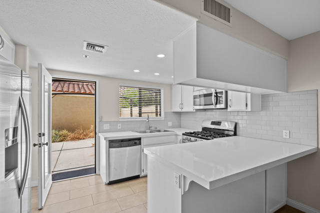BEAUTIFULLY RENOVATED 3 BEDROOM/2 BATH CONDO W/2-CAR GARAGE located in the charming gated community of Mountain View Falls. Freshly remodeled, the two-story unit has new tile flooring downstairs, new vinyl flooring upstairs, new quartz countertops throughout, and new washer/dryer in garage. The ground level consists of living/dining room area, kitchen, 1 bedroom (or home office) and1 bathroom; second level has 2 spacious bedrooms and 1 bathroom. Kitchen comes with newer stainless steel appliances - refrigerator, stove, microwave and dishwasher. This gorgeous condo has a large private patio that leads to the 2 car garage. The community boasts tennis courts, basketball courts, 2 community pools/spas and a clubhouse. Trash & gardening are included with the lease. Tenant pays water, gas, electricity and cable. Conveniently located close to El Paseo restaurants and shopping, golf venues and 1-10 freeway.