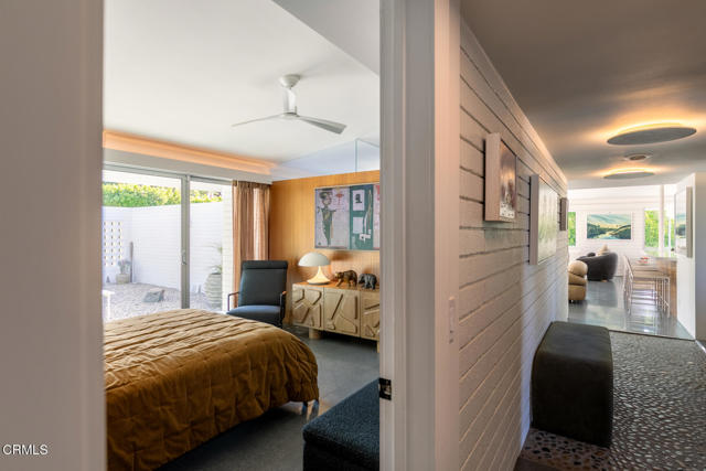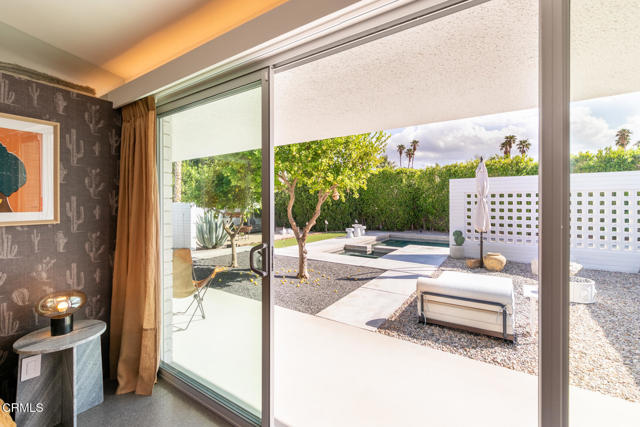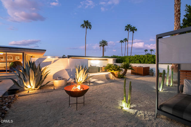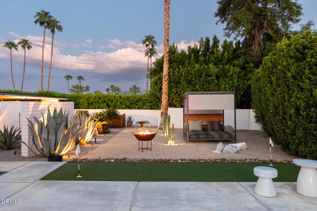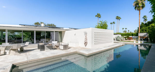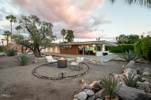 A true collector's item in the world of desert modernism, 73271 Buckboard Trail--known as the Paulette Herbert Johnson House--is a 1958 mid-century masterpiece by celebrated architect Walter S. White. Rarely does a home of this significance come to market--an exquisitely maintained and restored example of Palm Desert's architectural history, blending timeless design with resort-style living.Step through a pebble-stone entry into an open, light-filled floor plan where floor-to-ceiling glass walls, terrazzo floors, original wood paneling, and signature masonry walls create a seamless indoor/outdoor flow surrounding the living and dining areas. The custom wood panel kitchen cabinetry pays homage to its mid-century roots, while two beautifully appointed bedrooms feature cork-lined closets and bathrooms with authentic period tile and lighting. Natural light pours through every corner, framing breathtaking views of the surrounding gardens, mountains and desert skyline.The grounds are a modernist playground: a Parker-style pebble bottom pool and spa, outdoor kitchen with barbecue and pizza oven, bocce court, putting green, lounge gazebo, firepits galore, and room for an ADU--all set against panoramic desert vistas. A spacious two-car garage plus additional parking for up to six vehicles completes the estate.Located in the historic Silver Spur Ranch enclave, this home is just minutes from El Paseo's dining and shopping, the Living Desert Zoo, and Palm Desert's country clubs. More than a residence, it is an architectural icon--the Paulette Herbert Johnson House by Walter S. White--restored to its full glory and offered as a rare opportunity to own a celebrated piece of California modernism.