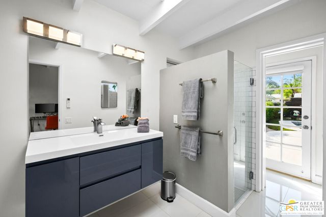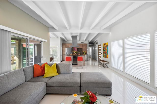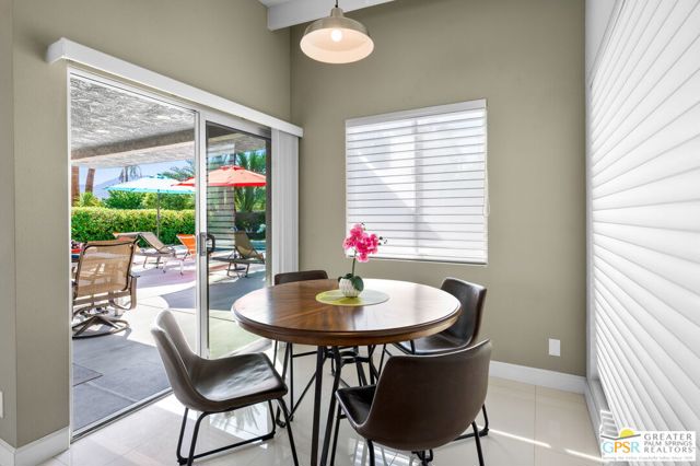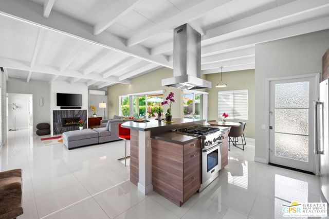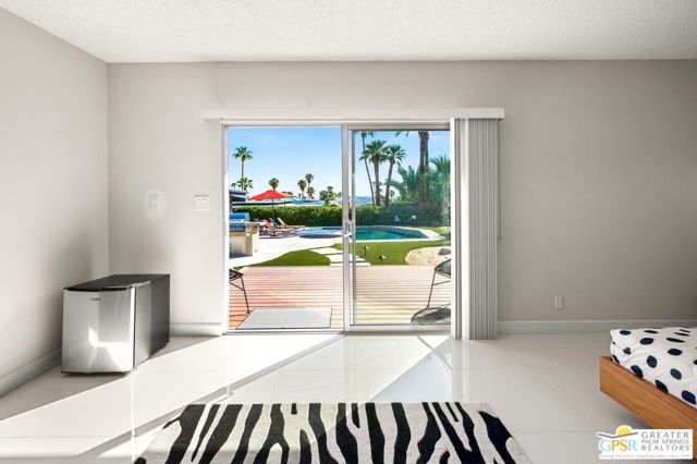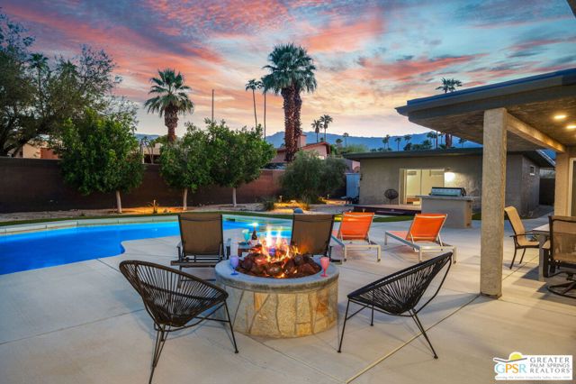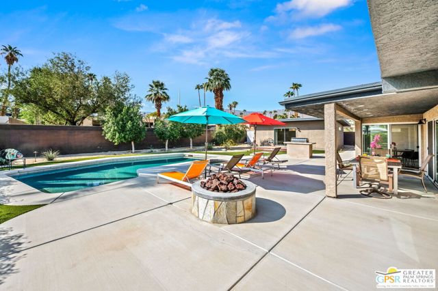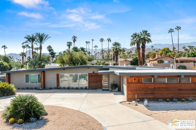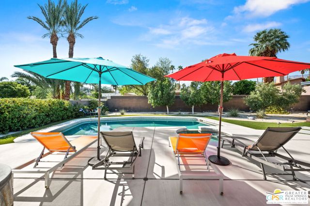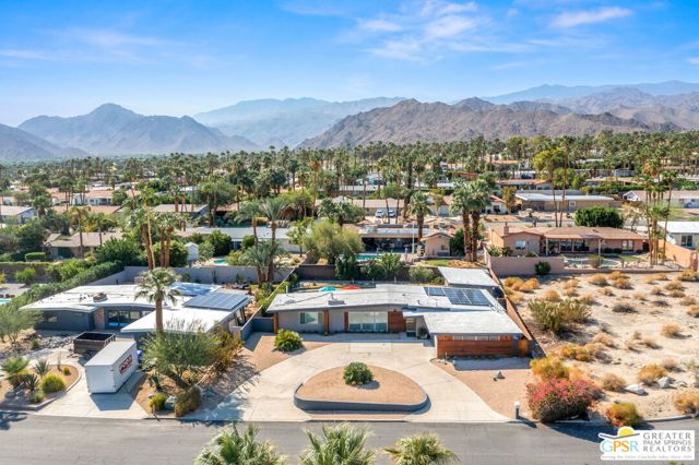 If location is everything, this home in the highly sought-after Silver Spur Ranch neighborhood of South Palm Desert truly delivers. Perfectly situated at the end of a quiet cul-de-sac, the property is South-facing and directly adjacent to Ironwood Park. Its curb appeal is exceptional, featuring striking redwood siding accents, a circular driveway, Milgard windows and doors, and a backdrop of swaying palm trees. This Mid-Century Modern gem underwent a complete renovation in 2018 and has been styled in a chic Contemporary design offering a move-in-ready, turnkey experience. Furnishings are included with just a few exceptions. Step into the backyard and you'll be captivated by sweeping views and a resort-like setting, complete with a saltwater pool, spa, built-in BBQ, and gas fire pit all in a private, serene atmosphere. The detached casita provides a spacious third bedroom and bath, ideal for guests or a private retreat. Inside, the kitchen is a showpiece with an island bar, breakfast nook, Thermador range, and Maytag refrigerator. A fully owned solar system, installed in 2022 adds modern efficiency and value. Silver Spur Ranch, a charming historic neighborhood dating back to the 1950s, is celebrated for its diverse architecture and stunning mountain scenery. The home is minutes from El Paseo's premier shopping and dining, directly across from the Living Desert, close to several golf courses, and just five minutes from scenic trailheads offering hikes from one to sixteen miles. This is a rare opportunity to own a dazzling, impeccably updated home in one of Palm Desert's most desirable communities.