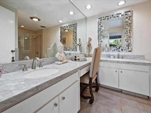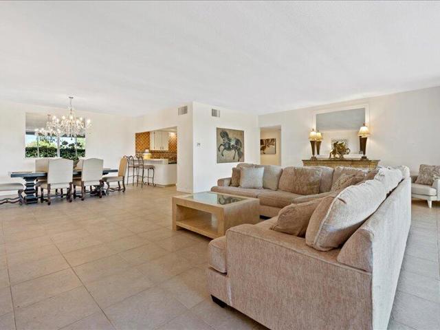 .Spacious corner unit with tile flooring throughout, featuring versatile open living and dining areas. The large terrace is ideal for entertaining or relaxing and offers privacy and views of beautifully lit trees at night. 9-foot floor-to-ceiling windows fill every room with natural light; the screened patio with sliding glass door provides easy outdoor access. Living room includes Spanish style tiled fireplace. The kitchen includes beautiful hand-painted Spanish tile backsplash, ceramic tile counters, and a breakfast bar. Both spacious bedrooms have ample closet space and direct access onto the terrace. HOA dues include cable TV with HBO/Showtime, Internet Wi-Fi service, air-conditioning, water, gas, trash, much more. This spacious condo promises a blend of privacy and comfort, making it the perfect retreat for those seeking a serene yet vibrant lifestyleDesert Island is a unique hi-rise condominium community nestled on a 25-acre island surrounded by a sparkling lake and 18-hole championship golf course. Centrally located to The River shopping, movies & restaurants.
