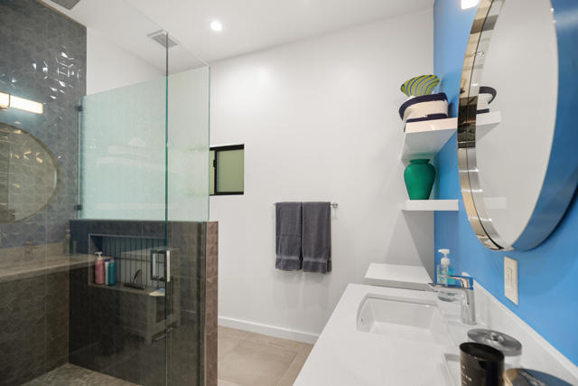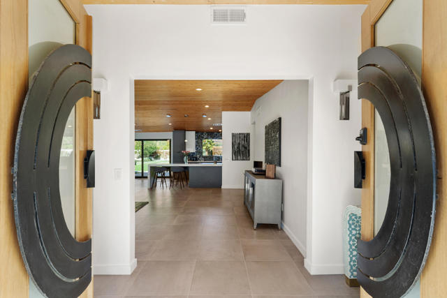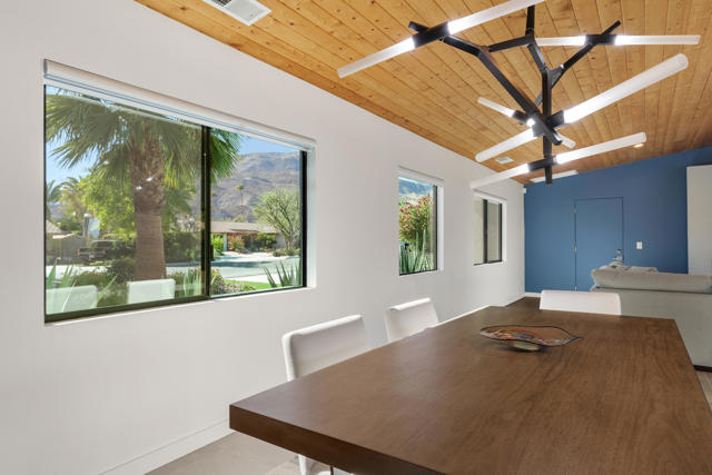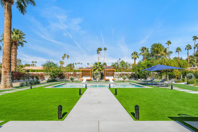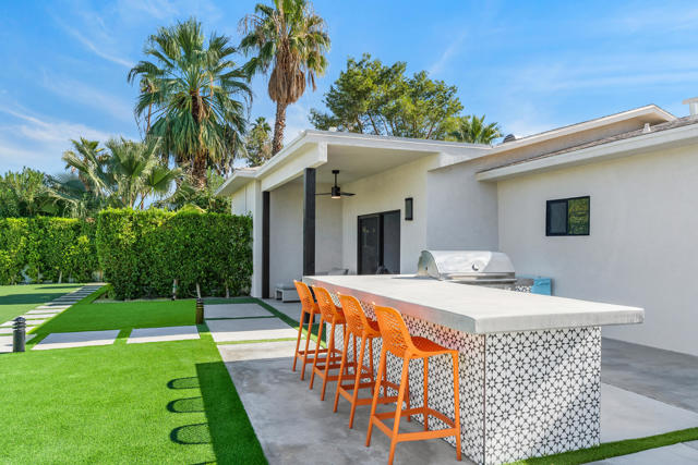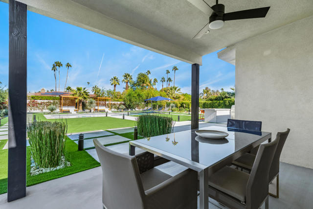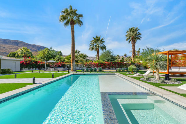 Welcome to a beautiful modern retreat in Rancho Mirage, where luxury and timeless design meet. This 4-bedroom, 3-bathroom home, set on a private .42-acre lot, captures the essence of resort-like living with sweeping mountain views and sophisticated indoor-outdoor spaces. The light-filled Great Room greets you with floor-to-ceiling windows, vaulted wood plank ceilings, and contemporary light fixtures. Concrete-look porcelain tile flooring and a sleek electric fireplace add a touch of refined elegance. The gourmet kitchen features Viking appliances, a wine fridge, waterfall quartz countertops, and a spacious breakfast bar. The primary suite is a true sanctuary with custom finishes, a walk-in shower, dual sinks, and a well-organized closet. An additional suite with a private entrance and kitchenette offers a versatile casita option. A leased solar system ensures energy efficiency. Outside, this home is an entertainer's dream. Privacy walls surround the backyard's custom pool, spa, tanning shelf, two luxury cabanas, a fire pit, a bocce ball court, and BBQ. Landscape lighting enhances the space, creating a stunning desert oasis. Situated in the heart of Rancho Mirage, this property is minutes from Palm Springs, Palm Desert, and the famed El Paseo shopping district, with easy access to golf courses, hiking, and top dining. This home offers a blend of privacy, elegance, and modern desert living in one of the Coachella Valley's most desirable locations.