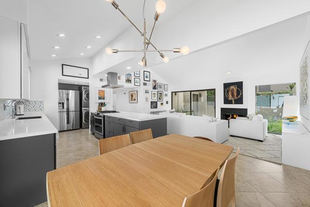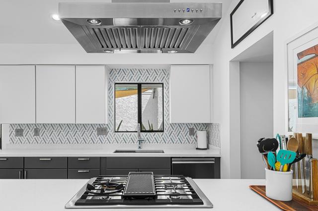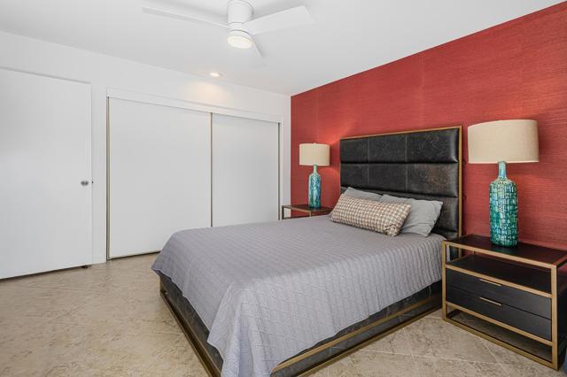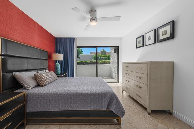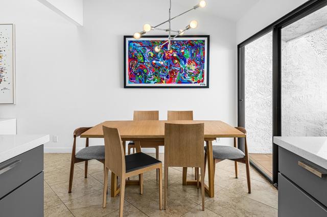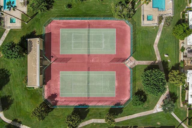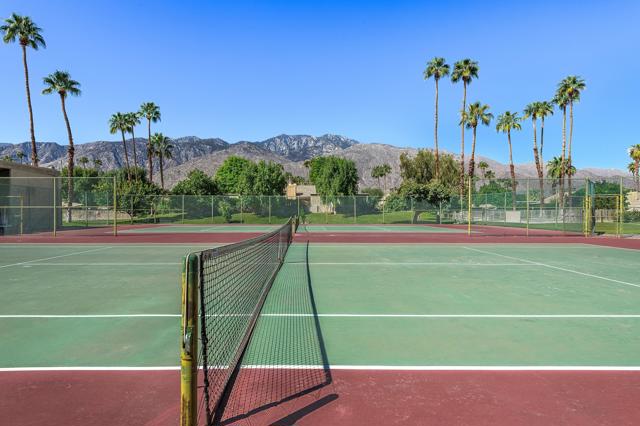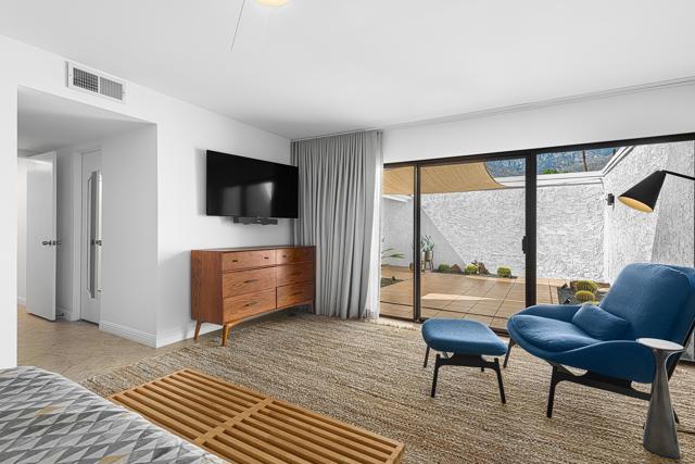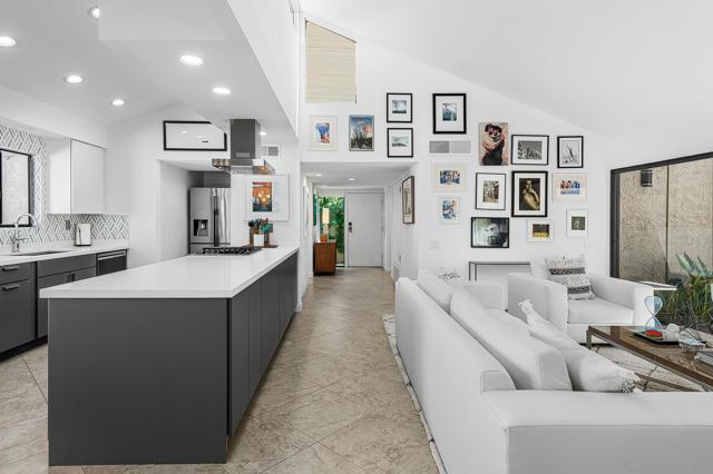 This Hugh Kaptur designed condo is a true 3 bedroom 2 bath with an attached 2 car garage. Designed around a large interior patio this unique concept allows for in-home outside entertaining with complete privacy! Situated in one of the most desirable areas of the complex, this condo exudes a welcoming neighborhood vibe! Inside you will find an open floor plan with high vaulted ceilings and walls of glass allowing the soft flow of light throughout your main living areas. Updated kitchen with a large island, high end appliances and tons of cabinet space. A neutral style tile is continuous throughout the entire home that engenders an expansive flow from room to room. The spacious Primary Suite with room for a cozy sitting area with direct access to your outdoor patio. Primary bathroom has a double vanity and walk-in shower. Two guest bedrooms are on the opposite side of the home that share a central bathroom. There is a 2nd large patio that is perfect for morning coffee or basking in the desert sun. Saddlerock Gardens is a boutique complex of 43 patio homes with 2 pool/spas and 2 tennis courts. Low HOA that covers building, grounds and cable tv. Worryfree style living that is walking distance to restaurants, shopping and coffee houses.