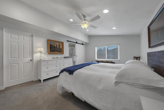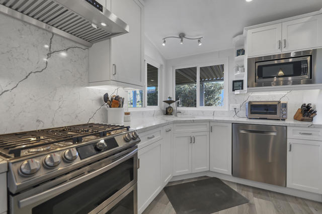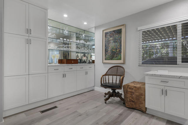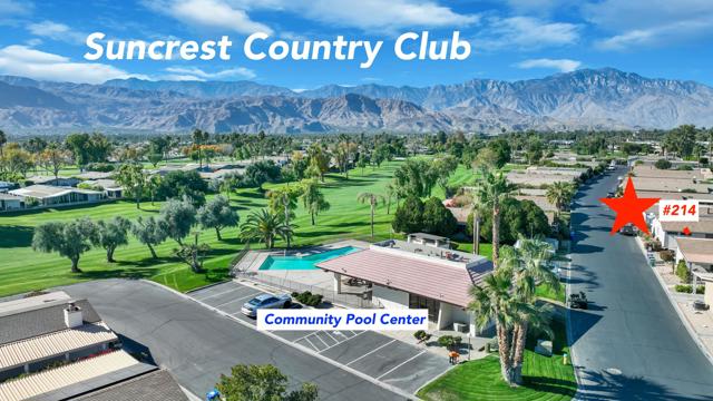 This beautifully updated home blends contemporary style with comfortable desert living. The light, open floor plan showcases vaulted ceilings, luxury vinyl plank flooring with a modern wood look, and a sleek Quartz-accented fireplace with custom shelving. The adjoining den offers versatility and quality craftsmanship, featuring built-in cabinetry, glass bar shelving, a built-in desk with soft-close drawers, Quartz countertops, and LED ceiling lighting -- ideal for use as an office, media lounge, or hobby space. The remodeled kitchen impresses with an oversized island, Quartz countertops, upgraded stainless appliances, soft-close and roll-out cabinetry, and recessed LED lighting. Every detail reflects thoughtful updates, including a newer (2022) HVAC system, energy-efficient vinyl windows, newer roof, and renovated baths. Additional enhancements include fresh interior paint, plush carpeting in bedrooms, stylish plumbing and lighting fixtures, organized closets, a glass front entry door, French doors, and a newer water heater -- all contributing to a move-in-ready home that lives beautifully. The spacious primary suite features a large walk-in closet and an elegant ensuite bath with double vanities and updated finishes. Outdoors, the wrap-around patio captures scenic views of the 5th fairway of the community's 9-hole golf course framed by picturesque mountains -- the perfect setting for morning coffee or evening relaxation. Convenient laundry room and generous storage space add everyday functionality. Suncrest Country Club is a private, gated 55+ community of 359 homes offering resort-style amenities including 3 sparkling pools/spas, tennis, pickleball, and golf. The clubhouse features a cafe, billiards room, library, and active social calendar. Ideally located near grocery stores, restaurants, and everyday conveniences -- just minutes from Eisenhower Health Campus, popular box stores to the north, and the luxury shopping and dining of El Paseo to the south. Palm Springs International Airport is only about 10 miles away.