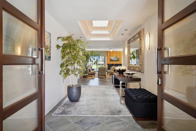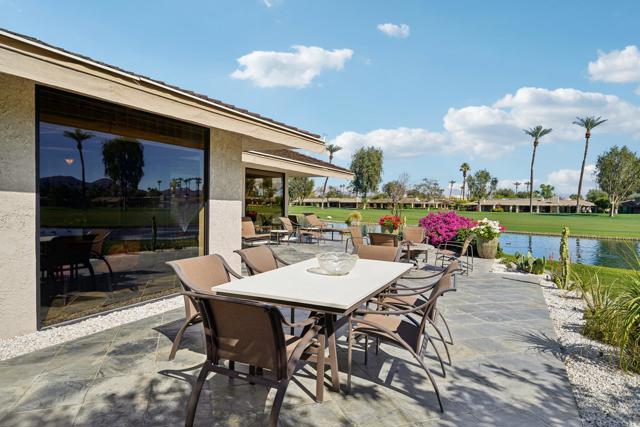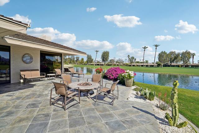 Rarely on the market, this A+ location has exclusive lakefront living at this remarkable residence set within The Springs Country Club. Relax with guests at the end of the day as you admire amazing views over the 16th and 17th fairways towards the commanding Santa Rosa mountains in the distance. The floorplan instantly feels generous in size and opulent, thanks to an expansion of the exterior walls resulting in 3,850 sq ft of light-filled living spaces. Large windows frame the breathtaking outlook, and the three feature fireplaces warm the open-concept layout, ensuring a peaceful ambiance on cool nights. Remodeled kitchen with high-quality appliances, an abundance of Anigre (African hardwood) cabinetry, and high-end fixtures - overlooking the breakfast nook. A family room extends the living space even further, and there is an office and a remodeled laundry room. A spacious primary suite features two walk-in closets, a fireplace, and a luxurious en-suite. Bedroom #2 is currently being used as an office/den. It offers a walk-in closet and shares a Jack-N-Jill bathroom with bedroom #3. All baths have already been tastefully updated. Additional features include double-pane windows throughout, handicap access to the bath, newer air-conditioning units, insulated walls, and a 29-panel owned solar system. This incredible home is set along a tranquil cul-de-sac within a highly sought-after community. An 18-hole golf course, tennis and pickleball facilities, 46 swimming pools, and a fitness center will delight those who want to stay active. The Springs is where you belong!