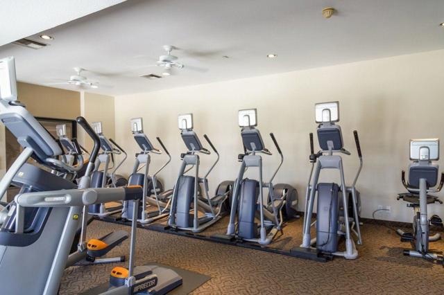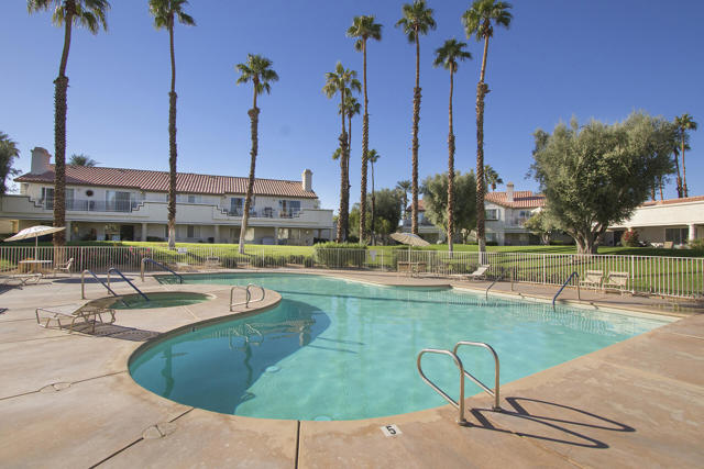 Sought after South-facing, single level, end unit! 2 Large bedrooms (formal dining could easily be converted back into a bedroom or den), 2 baths + powder room in 1,814 SF. Home has lovely, European-style contemporary kitchen, hardwood and tile floors, shutters, walk-in closets, high vaulted ceilings, entry courtyard, two car garage and more ... located on a large greenbelt with views of a sparkling pool! This one won't last!