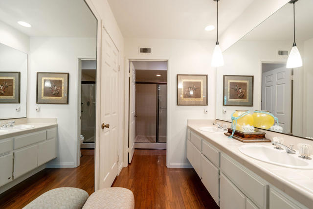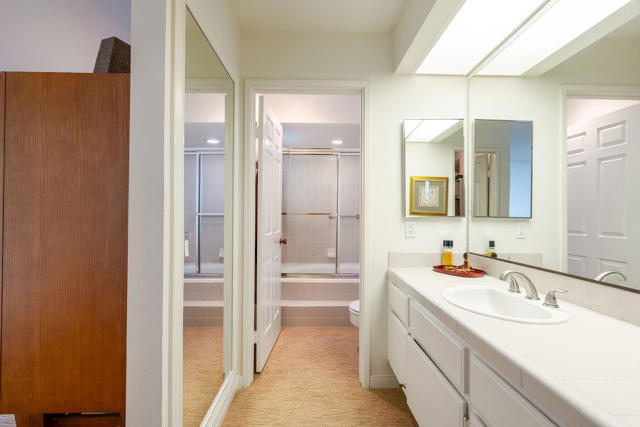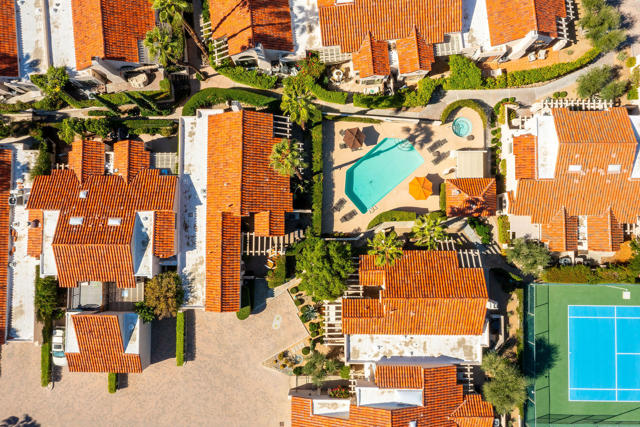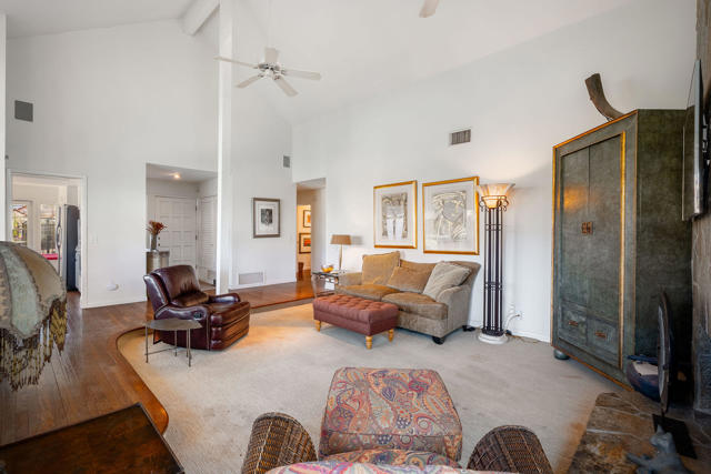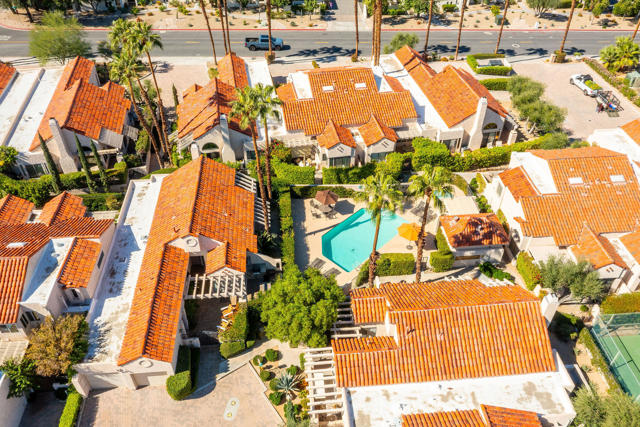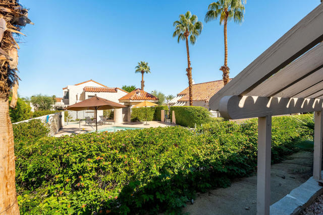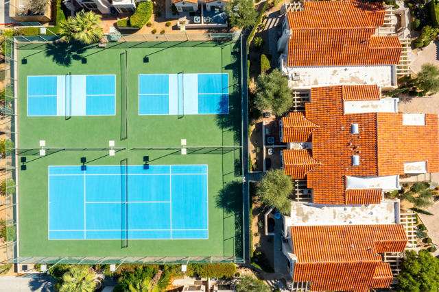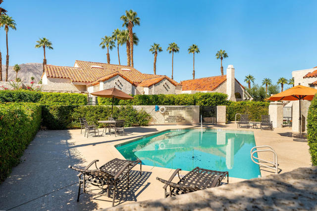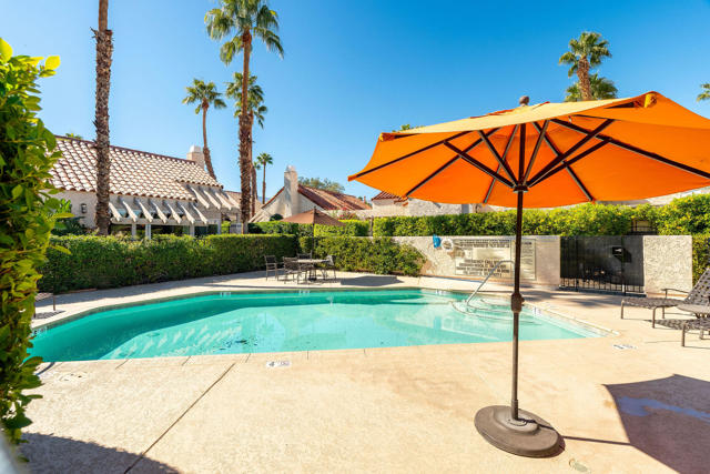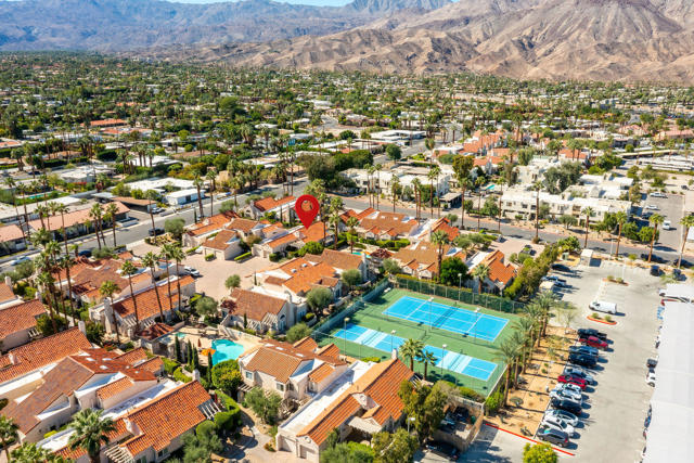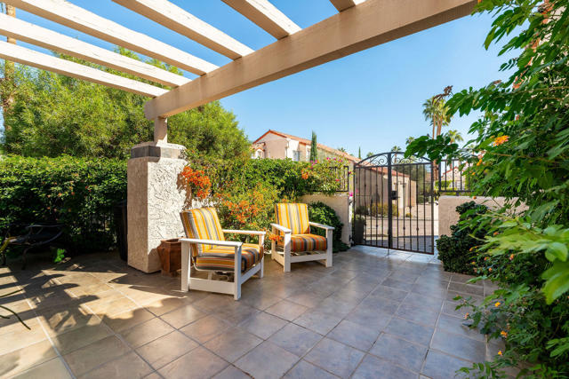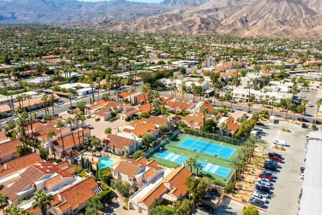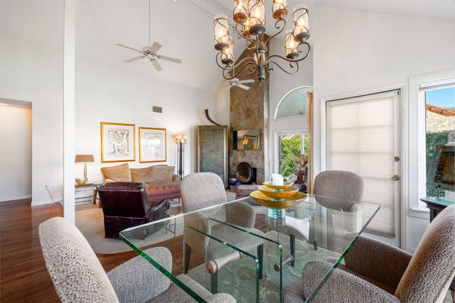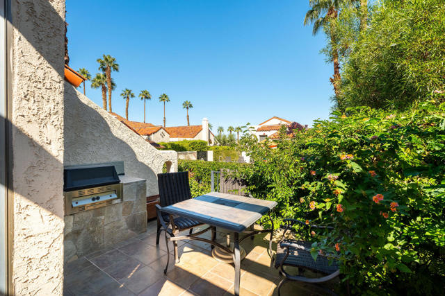 Desert Living at El Paseo Village!Step into this charming end unit just steps from El Paseo and The Gardens, offering the perfect blend of comfort and convenience. This rarely available home features 2 spacious, separated master suites each with walk-in closets and private baths with dual vanities plus a guest half bath. The primary suite includes a walk-in closet and ensuite bath with dual vanities. The guest suite offers its own private bath with shower The open, light-filled layout showcases 16ft vaulted ceilings, hardwood floors, a beautiful stone fireplace, and a formal dining area perfect for entertaining. The large eat in kitchen opens to private front and rear patios complete with a built-in gas BBQ, a private 2 car garage. Two sparkling pools and two lighted tennis courts. Well maintained community. Just a short walk to El Paseo's Luxury shopping, dining, and art galleries. Call for a private tour.