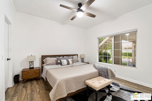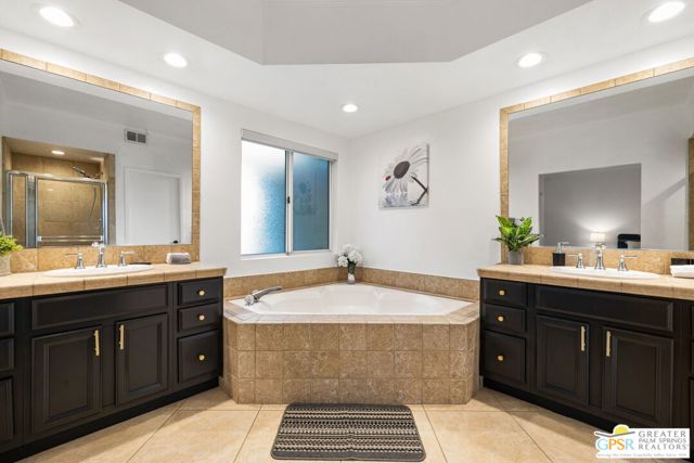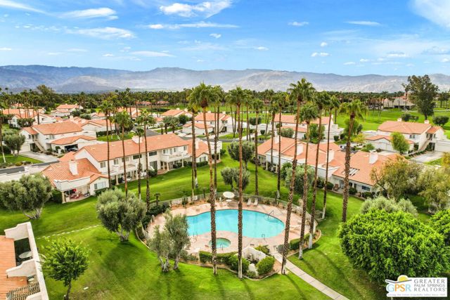 Escape to paradise in this lower-level, 3-bedroom, 2.5-bath condo with 1,814 sq. ft. of comfortable living space in the highly desirable Desert Falls Country Club. The updated kitchen features granite counters and a cozy breakfast nook, while the spacious living room offers a fireplace perfect for cool desert evenings. Tile flooring in the common areas and laminate in the bedrooms provide easy maintenance. The primary suite boasts a large bathroom with dual sinks, a soaking tub, walk-in shower, and a spacious walk-in closet. Step outside to the back patio equipped with a misting system and enjoy gorgeous pool views, creating the perfect setting for relaxation. Additional highlights include a 2-car garage with a large driveway for extra parking. The HOA covers cable, high-speed internet, and access to resort-style amenities such as golf, tennis, pickleball, a fitness center, and the clubhouse all without requiring a membership. Your guests and renters can also enjoy free access to these amenities. For added security, Desert Falls is a gated community patrolled 24/7 for peace of mind. This prime location is just minutes from El Paseo dining, Acrisure Arena for hockey games and live events, as well as the upcoming DSRT Surf wave pool, making it an even more attractive destination for vacationers. Whether you're seeking a second home, investment property, or a winter retreat, this stunning condo offers it all. Don't miss out on this exceptional opportunity!
