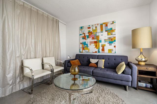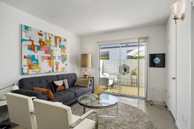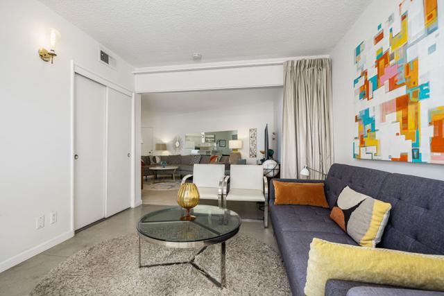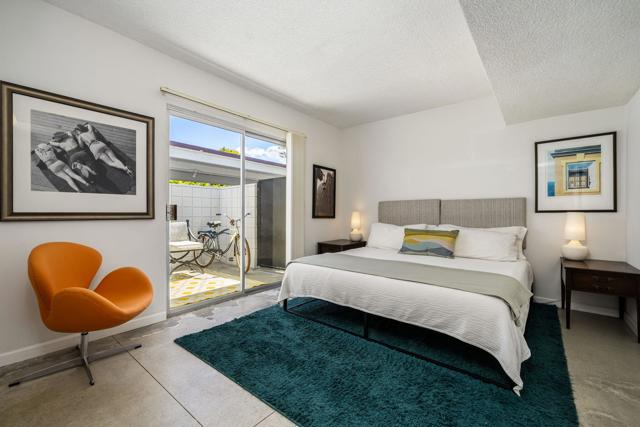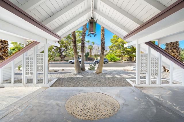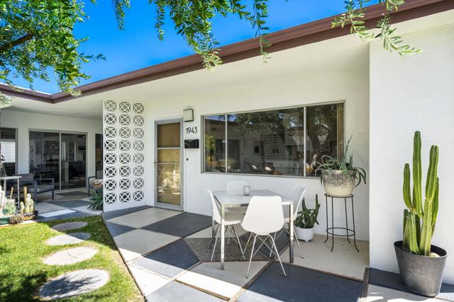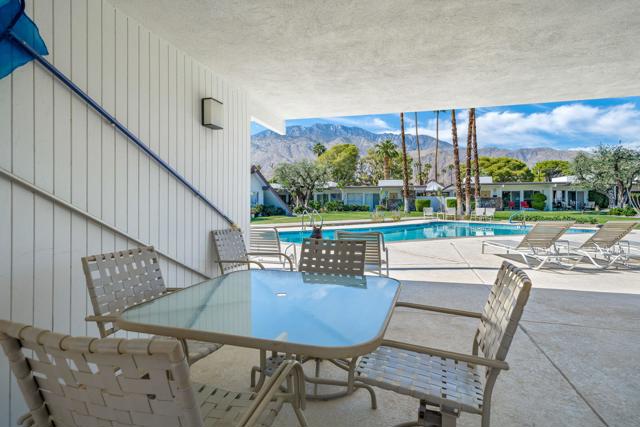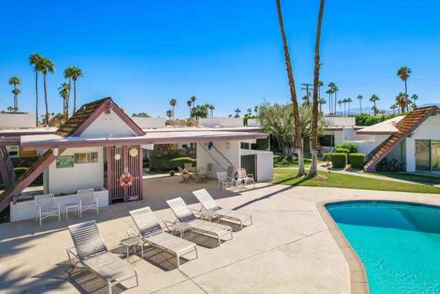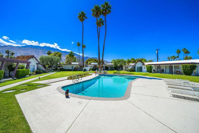 Enjoy original mid-century details at this 1964 time capsule, designed and built by Charles Du Bois in a Polynesian-inspired style. Desert Lanai 3 is a small, private association of just 22 units. Step inside to the open concept living area, featuring sleek cement flooring and many of the original, well-preserved mid-century features intact. The primary bedroom offers an en-suite bathroom and access to the private patio, providing a peaceful sanctuary to unwind and rejuvenate. The 2nd bedroom currently functions as a den with a pull-out for guests. The half bath is perfect for use while entertaining. A covered front patio overlooks the community pool, inviting you to take a refreshing dip on warm summer days. The back patio is private and a perfect spot to enjoy your morning coffee. Immerse yourself in the serene atmosphere of Desert Lanai as you relax by the poolside, surrounded by meticulously maintained grounds, mountain views and swaying palm trees. Located in central Palm Springs, close to renowned shopping, dining, entertainment, and the airport. This third phase of Desert Lanai is 50+, pet free community.