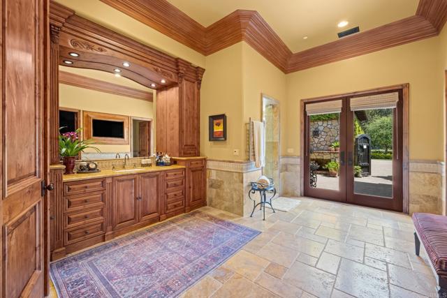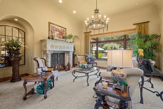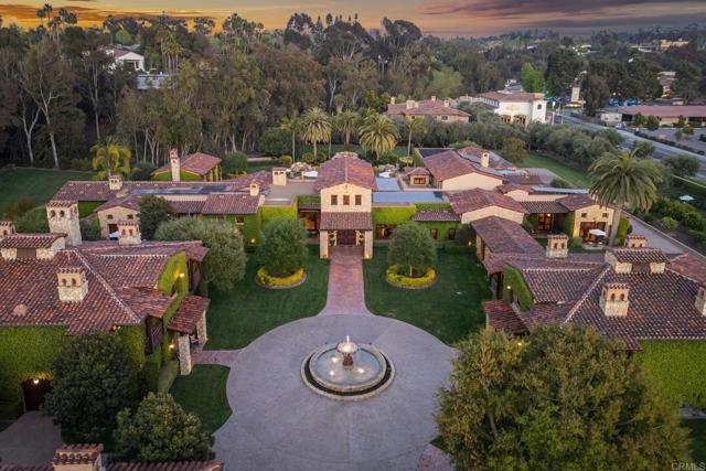 This Magnificent Compound is a one-of-a-kind Village estate set on nearly 5 fully usable, walled and double gated acres in Rancho Santa Fe. Designed and built by Sylvester Construction, this private compound offers over 20,000 sq ft of refined living space across four separate buildings, including 10+ bedrooms, 17 bathrooms and unmatched resort-style amenities. The main, single level, residence features 5 ensuite bedrooms, dual his-and-her master bathrooms with extra large walk in closets and a private outdoor area with a waterfall, formal living and dining rooms, a cherry wood paneled study, music and game rooms opening to a wine bar and climate controlled wine cellar, his and her offices, and an expansive family room with disappearing lift and glide doors that recede into the wall for seamless indoor/outdoor living. The Chef's kitchen has high end Viking appliances, four Viking ovens, a Sub-Zero refrigerator, walk in pantry and a vast center island. Additional structures include a private theater house with a coat check, full snack and drink bar and game room, a 2-story collector’s showcase building with a full gym (or fits 10 cars) and a 3 bedroom guest house upstairs, plus a detached 2BR guest house with an office and attached 2 car garage. The gym was originally built to be a high end barn and could easily be converted. There is plenty of space for a large corral and jumping area. Trails can be accessed from the property for long trail rides. Outdoors, enjoy a resort style pool with multiple waterfalls, two covered cabanas with wood burning fireplaces, an outdoor BBQ area, and tranquil courtyards surrounded by lush, mature landscaping. The entire property is run by paid solar including the pool. Inspired by ancient Italian villas and Tuscan design, this opulent estate offers total privacy, high-end finishes, and Southern California luxury at its finest.