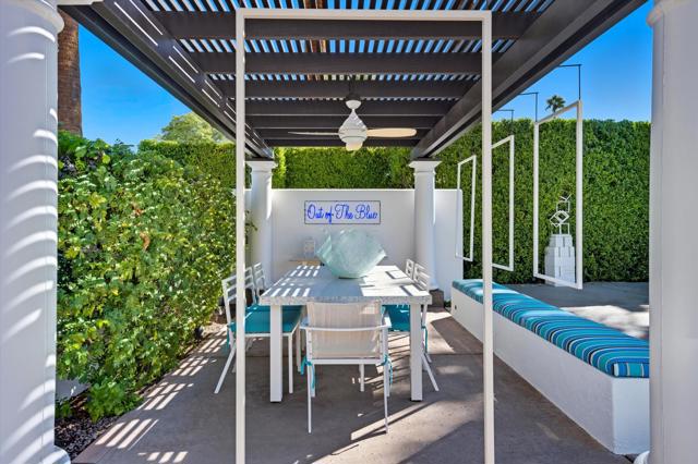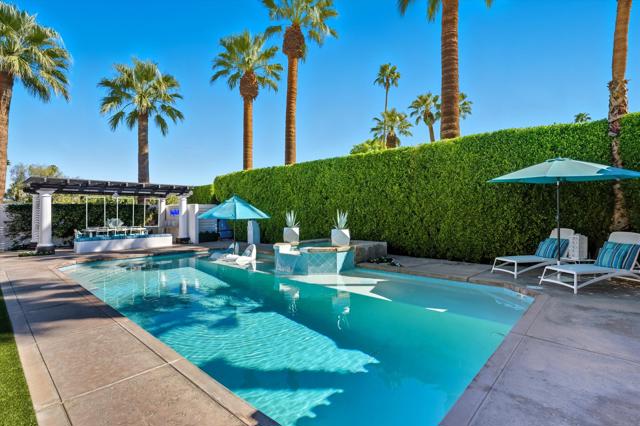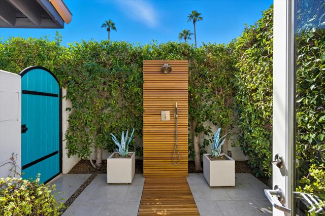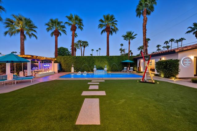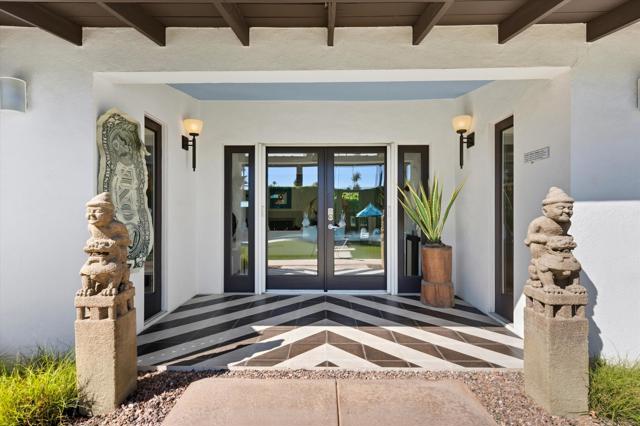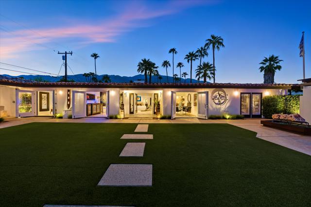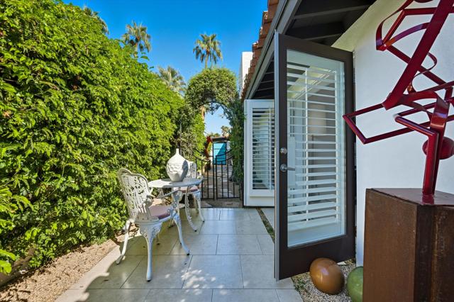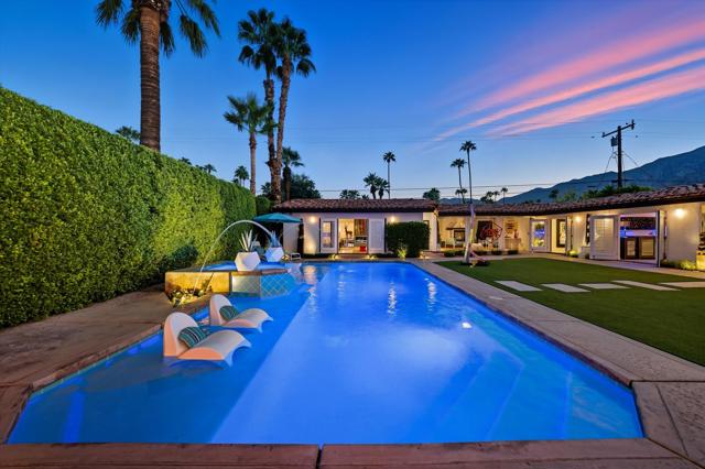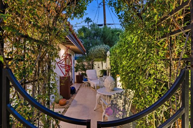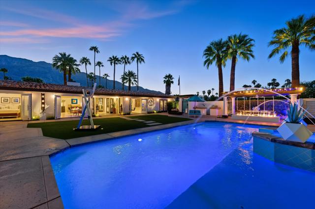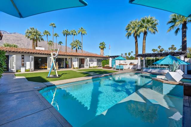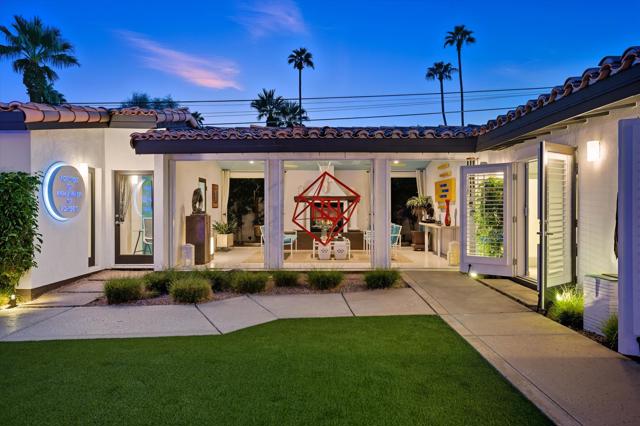 Classic meets contemporary in this modern Hacienda located in desireable South Palm Springs on land you own with no HOA. This postwar 1948 modern California Ranch was conceived through the collaboration of developer, Paul Trousdale working with noted architect, Allen Siple. Embracing indoor/outdoor living with approximately 3,000 SF on one level featuring high ceilings, clerestory windows and other features that matured into Desert Mid Century Modernism a decade later. Walled and gated, the residence revolves around a central pool courtyard. After a 'down to the studs' remodel, the house now features 4 bedrooms and 4 baths, a heated loggia, and a 52 panel array of owned solar grid. A bonus is the detached guesthouse/casita (which currently produces income through a home share permit with the city. Facing the Taquitz Creek recreation trail and with a gallery + spa aesthetic, this unique property offers elevated living within your own private compound. The home has been featured in numerous publications. Now offered partially furnished (per inventory list) for a new sophisticated buyer.