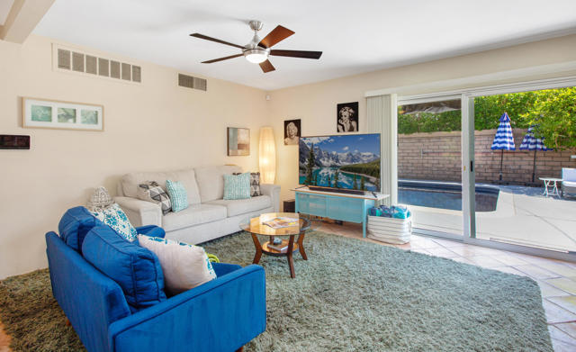 AVAIL NOW- FULLY FURNISHED. Mid-Century gated retreat home in the South End Palm Springs available as a 30 DAY MINIMUM RENTAL. Property is fully fenced with electric gate and plenty of room for off-street parking. This light & bright open concept floorplan offers beautiful tile flooring throughout & an updated kitchen with quartz countertops and aqua subway tile backsplash for that tastefully added ''Pop of Color''. Enjoy your very own oversized pool w/ Southern exposure & views of the western mountains. The Backyard boasts a gas fire pit as well avocado, guava & citrus trees. On the West side of this home is the 4th bedroom with it's own private access to the backyard. Solar system & Tesla EV Charger in place. Whether you are transferring to the area for work or looking for a vacation rental, this home is an amazing opportunity! 30-Day Minimum Stay Required. Pets Allowed with owner approval