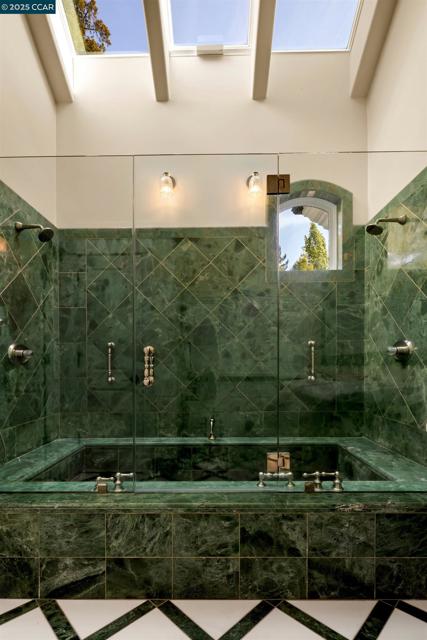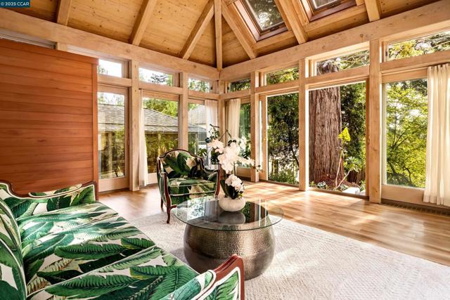 A landscape architect and urban planner designed this one-of-a-kind home on over a half-acre in the Berkeley Claremont Hills, capturing breathtaking views of the Golden Gate and Bay Bridge. The living room—with its vaulted ceilings and hardwood floors—forms the heart of the home, perfect for entertaining. Enjoy formal dining or casual meals in the open-concept kitchen and family room, where French doors open to the garden and pool. The main-level primary suite features a soaring ceiling, private outdoor access, and a spa-like bath with marble finishes, skylights, and dual walk-in closets. Upstairs, two additional en-suite bedrooms boast dramatic bridge views and overlook the open-concept living space below. The lower level includes a spacious family room, home office, gym, wine room, and a fourth bedroom with a private courtyard. Outdoors, mature landscaping by noted designers transforms the grounds into a private botanical garden, filled with color and texture throughout the year. The property also includes a separate 2-bedroom, 2-bath guest house (1,035 sq ft) with a full kitchen and a free-standing timber-frame bonus room. Peaceful and private, yet moments from Berkeley’s cultural and culinary destinations—this is an urban retreat in perfect harmony with nature.