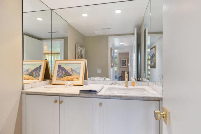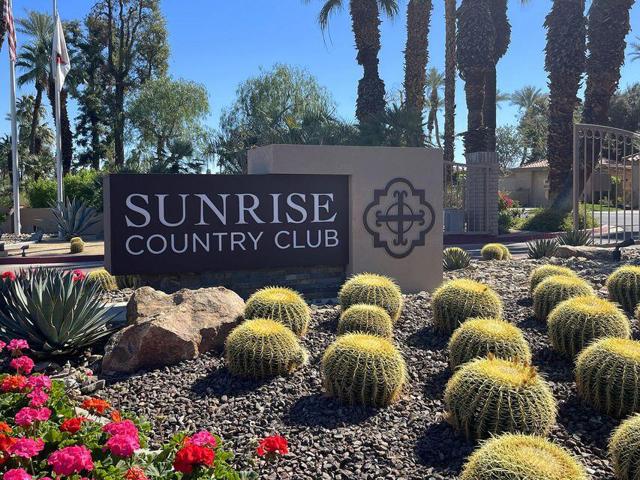 Outstanding END UNIT with FIREPLACE in beautiful Sunrise C.C. Secluded courtyard patio with fountain and mature landscaping. DOUBLE fairway views of the 12 and 13th holes. Across the street from huge greenbelt and community pool and spa. Quality renovation and upgrades including floors, cabinets, doors and windows, stainless appliances, plumbing fixtures and lighting. Garage has epoxy floors and loads of quality white cabinets. Updated AC, furnace and water heater, including AC in garage. Replaced garage door (insulated) and opener. GREAT location, END UNIT, easy access to BOTH gates and clubhouse, amenities. MIGHT be the BEST 1 bedroom unit ever offered in SUNRISE, see for yourself!