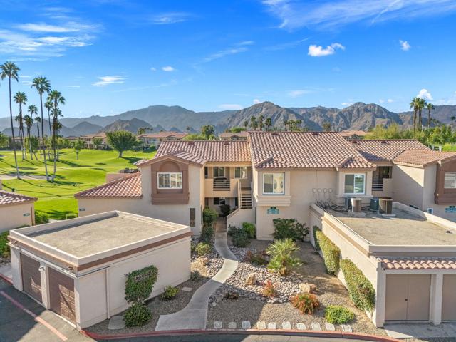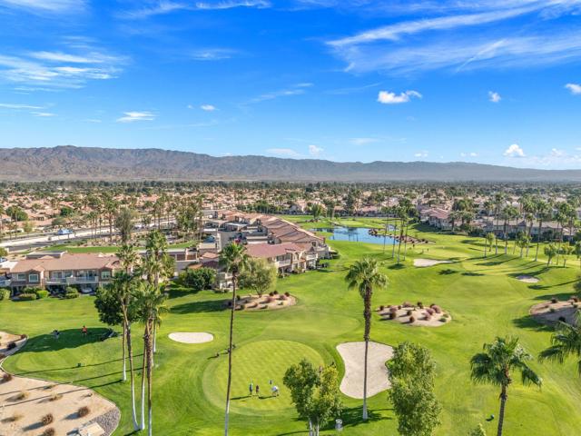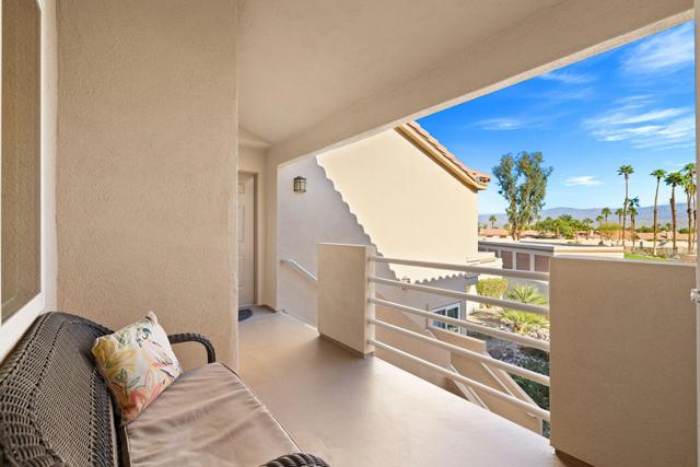 This upper-level view property is in a premium location with views in every direction. The balcony offers breathtaking views of fairways, lakes and mountain ranges. The interior features a great room floor plan with vaulted ceilings. The highly upgraded kitchen features custom cabinetry, granite counters, custom tile backsplash and newer stainless appliances. The kitchen is open to the living area. Both baths have been extensively upgraded with custom tile enclosures, newer cabinetry and granite counters. The guest bedroom is versatile and features office furnishings. This condo features luxury vinyl planking in the dine area. Decorated in warm neutral colors this property is offered furnished per inventory. With energy-efficient vinyl doors and windows the property combines luxury with sustainability. A newer HVAC system was installed in 2025, and ceiling fans and shutters enhance efficiency. New water heater in 2025. The inclusion of a 1-car garage adds practicality to the package. The complex's amenities include 6 community pools and spa areas, to provide ample opportunities for relaxation and recreation. The added perk of UNLIMITED golf on a Ted Robinson designed par 3 course. Featuring tennis and pickleball courts that are well maintained. Now the area headquarters for Helix Disc Golf, enhances lifestyle appeal. Low HOA dues covering essential services, cable, and internet make for worry-free living, while convenient access to shopping, dining, and transportation adds to the property's allure. Situated across from the Indian Wells Tennis Gardens, home of the Paribas Open, this property is perfect for either full-time residence or a luxury seasonal home. Overall, it truly offers a lifestyle of convenience and luxury, appealing to those seeking the ultimate in comfort and relaxation.