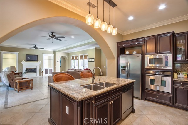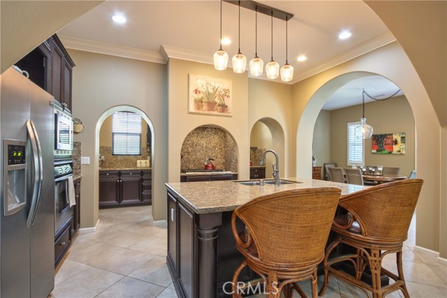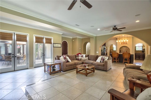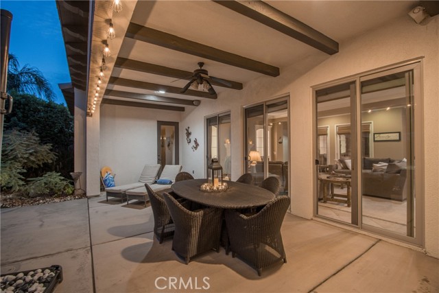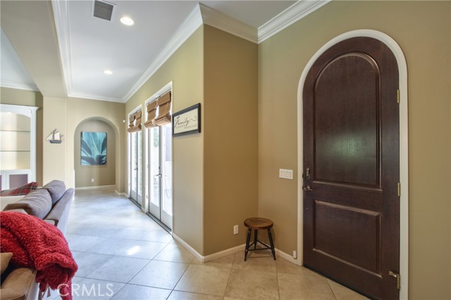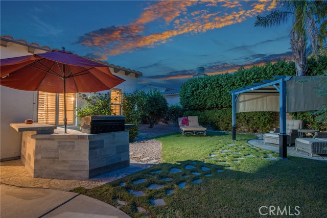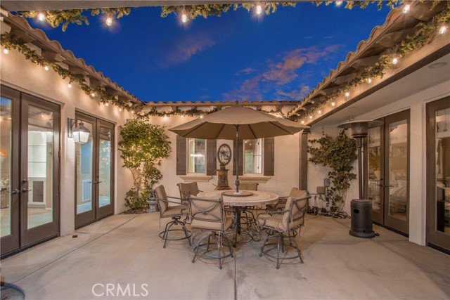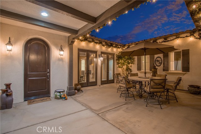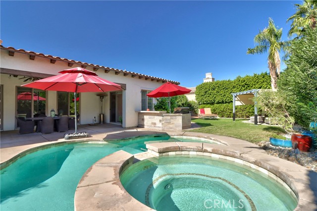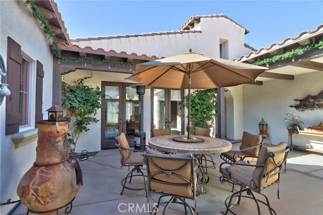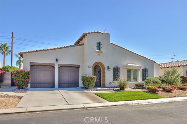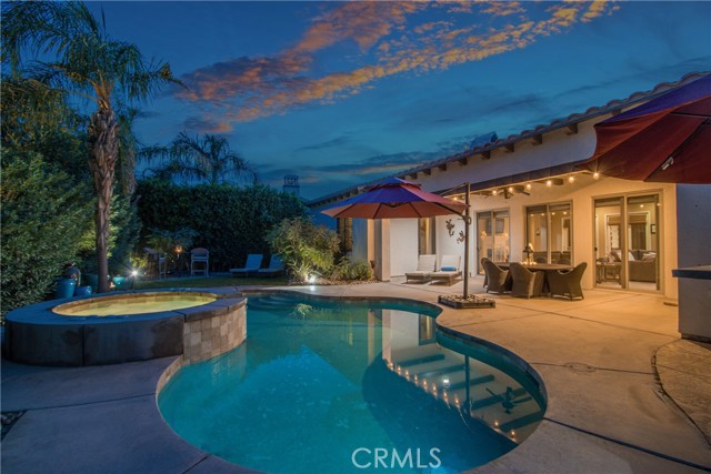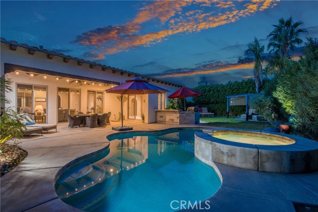 Spanish retreat located in the Estates of Carmela. This home captures the essence of La Quinta resort-style living with its striking Spanish architecture and inviting, open layout. High ceilings and graceful arches add character throughout the interior, enhancing the resort feel. The entry features a large, enclosed courtyard accessed through French doors, promoting wonderful indoor-outdoor flow. The expansive great room connects seamlessly to this courtyard on one side and, on the other, opens via three sliding doors to the spacious, private backyard oasis, complete with a pool and an enclosed California Room. The great room is open to the gourmet kitchen, which features a center island, beautiful designer lighting, a large walk-in pantry, and a butler's pantry/prep area with extensive storage and cabinet space. Designer lighting is a feature throughout the entire home. The large Primary Suite is a true retreat, offering a separate French door entrance to the backyard. The Primary Bathroom includes a spacious walk-in shower, dual sinks, a separate soaking tub, and a large walk-in closet. The two guest bedrooms are generously sized. One features a private patio area, and the other is large enough to function as a casita or office and includes French doors opening to the main entry courtyard. The guest bathroom is equipped with dual sinks and a large shower/bath combination. The backyard is spacious and private, providing numerous enclosed areas perfect for relaxing around the pool. It also features a custom BBQ island and a beautiful pergola for additional seating. The property includes a dedicated side area for gardening, complete with lemon and lime trees. The landscaping is drought-tolerant and equipped with sprinkler drip lines to all plants and trees, complemented by beautiful accent lighting. This home is being sold comfortably and tastefully furnished. Located in an elite and lively town, you will enjoy sunshine all year round and never a shortage of activities, including great entertainment, shopping, and dining. The area is also close to PGA Golf, the Indian Wells Tennis Garden, and offers abundant biking and hiking trails.
