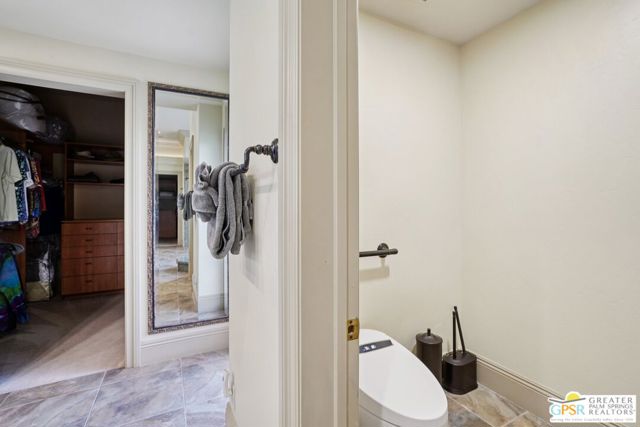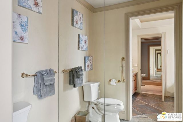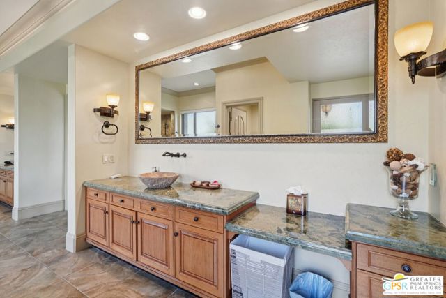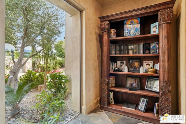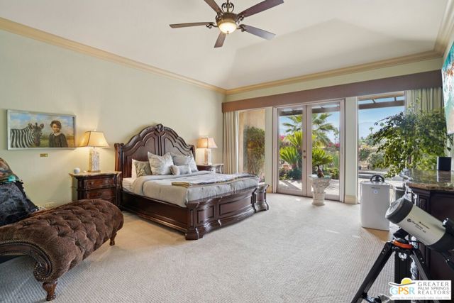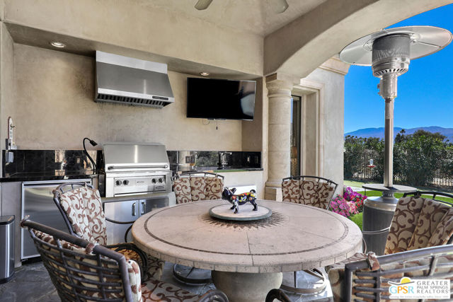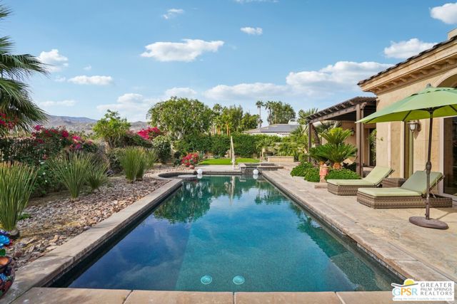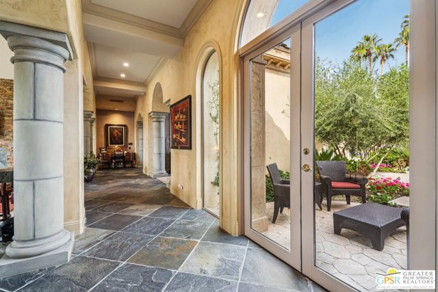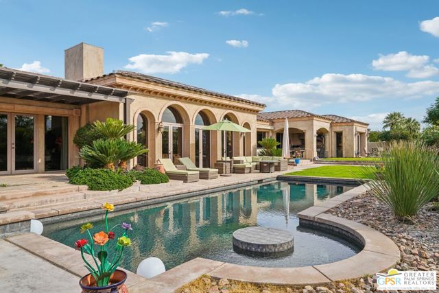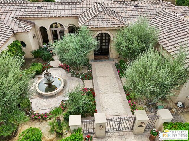 Sophisticated luxury meets timeless elegance in this exceptional Clancy Lane estate in one of Rancho Mirage's most prestigious addresses. From the moment you arrive via the circular drive and enter the gated courtyard with its tranquil fountain and grand custom doors, the home sets a tone of refined desert living. A dramatic foyer leads to the formal living room, where a stacked-stone fireplace, soaring ceilings, and French doors showcase sweeping south-facing mountain views. The chef's kitchen is a culinary masterpiece, featuring illuminated mahogany cabinetry, granite surfaces, a generous prep island with counter seating, 100-bottle wine cooler, and elite appliances including Sub-Zero refrigerator, Dacor Range top, Miele Dishwasher, double ovens, and dual warming drawers. Seamless flow connects the kitchen to both the intimate dining area and the inviting family room. Designed for effortless indoor-outdoor living, the residence features an expansive entertainment pavilion complete with built-in gas BBQ, mini refrigerator, mini dishwasher, sink, granite counters, ceiling fan, and outdoor TV. The resort-style backyard offers a PebbleTec pool and spa, each with independent heating systems plus a putting green, outdoor speakers, automatic lighting, and a cooling misting system for warm desert days. The thoughtfully designed floor plan provides exceptional privacy with two primary suites and an additional ensuite guest bedroom, each with patio access and electric roller shades. Additional highlights include a finished 3-car garage with extensive cabinetry and new refrigerator, a spacious interior laundry room with office niche, and a host of significant upgrades: double insulation, paid solar, four new A/C condensers, two new furnaces, two new tankless water heaters, and a new Kinetico water softener and filtration system. The home is also equipped with a security system and Ring cameras. 20 Clancy Lane Estates is a rare offering of elegance, comfort, and impeccable craftsmanship. This Clancy Lane estate embodies the pinnacle of Rancho Mirage luxury living.