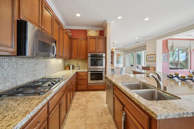 Located along the 9th tee box of The Golf Club at La Quinta, this stunning Tamarisk plan home with a detached casita is the epitome of desert luxury living. Spanning 2,726 sq. ft., this expansive single-story retreat offers 4 bedrooms, 4 baths, and a versatile den/office, all complemented by elegant tile flooring. Step through a wrought-iron privacy gate and Tuscan-inspired facade into a home designed for comfort and style. The great room dazzles with a custom-built entertainment center, crown molding, and oversized windows framing breathtaking backyard views. Entertain effortlessly in the sun-drenched formal dining room, while the adjacent chef's kitchen impresses with stainless steel appliances, slab granite counters, a sprawling prep island with bar seating, double ovens, a gas cooktop, and abundant cabinetry. Guests will appreciate their choice of accommodations in either the detached casita with a full bath or the main home's private guest suite. The primary retreat is a true sanctuary, boasting a bay window, tray ceiling, and spa-like en suite with travertine finishes, a soaking tub, a large shower enclosure, dual vanities, and generous walk-in closets. Outdoors, enjoy panoramic mountain and golf course views from two covered patios, complemented by a rock waterfall feature, a built-in BBQ station, and expansive concrete decking. With a separate third-car garage and proximity to the Santa Rosa Clubhouse, this extraordinary residence is a must-see for those seeking refined desert living!