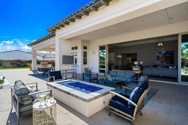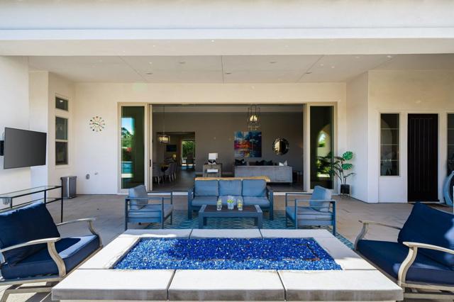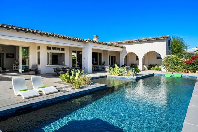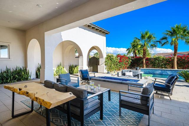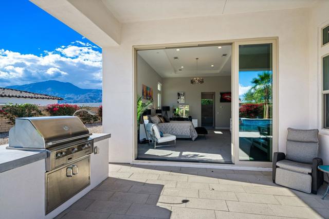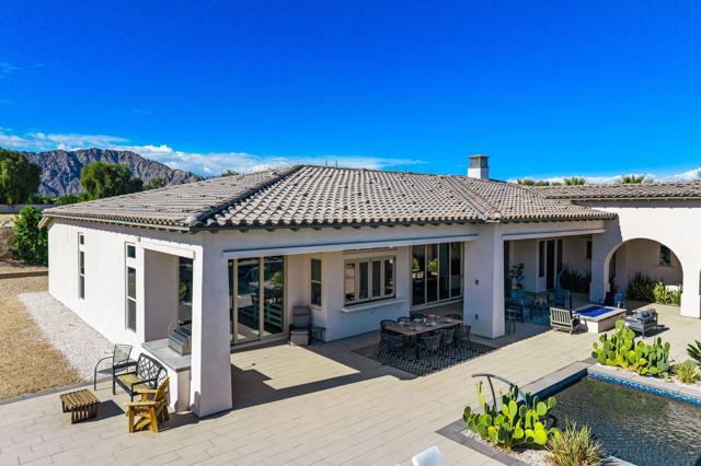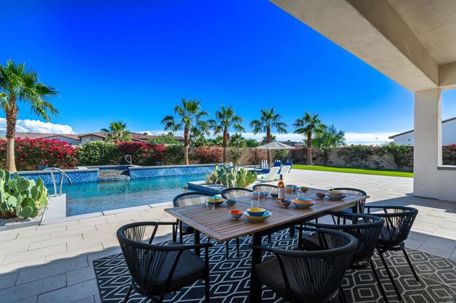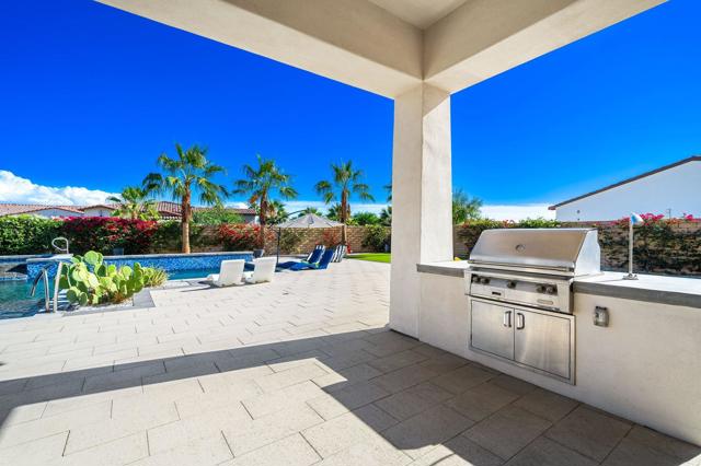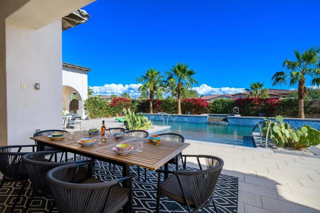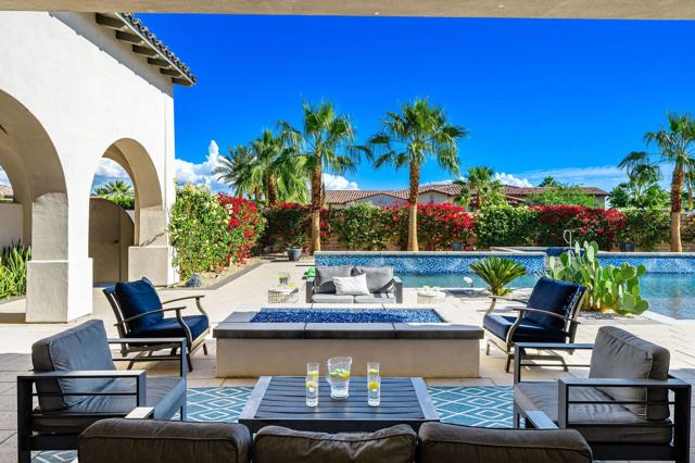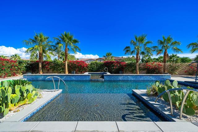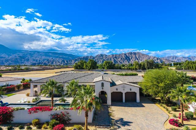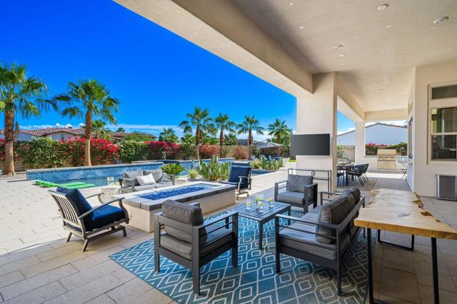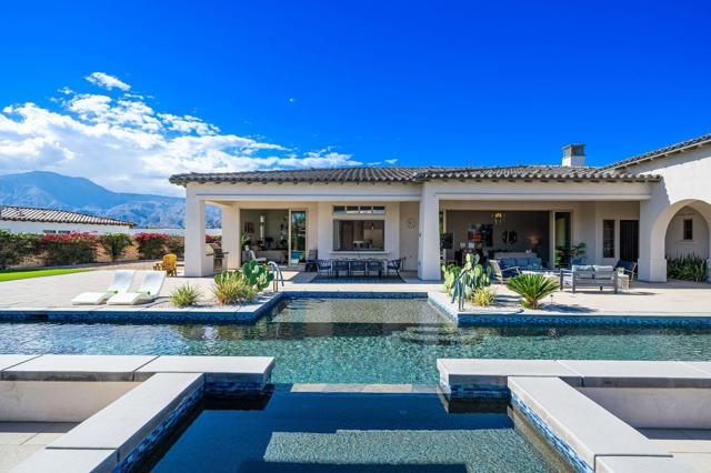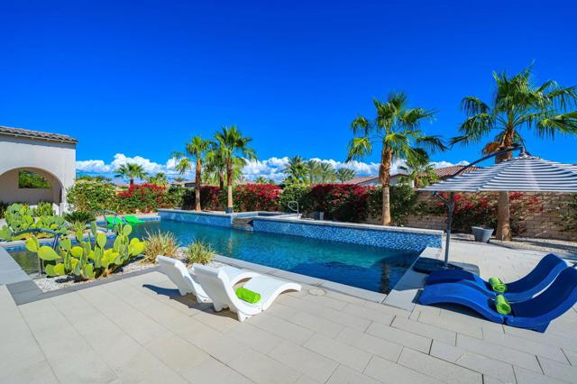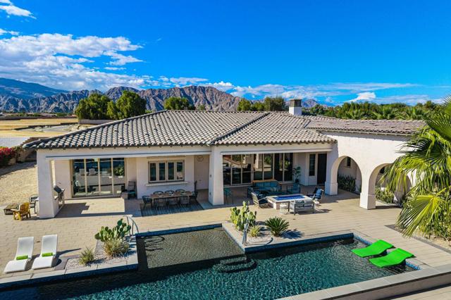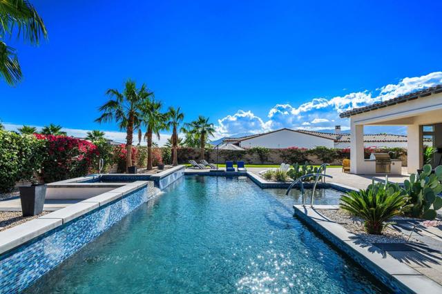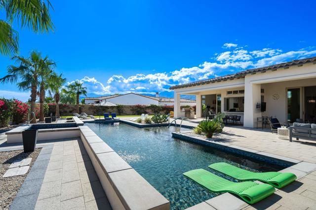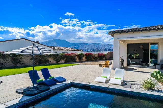 Welcome to Griffin Ranch--a premier, guard-gated community in La Quinta for those who expect nothing less than exceptional living. Perfectly positioned on a premium lot, this stunning and fabulously decorated estate is designed for seamless indoor-outdoor living and effortless entertaining, framed by panoramic mountain views and lush, maintenance-free landscaping. From the moment you arrive, the attention to detail is unmistakable--custom hardscaping, elegant pavers, and mature desert flora set the tone for the luxury lifestyle that awaits. Step outside into a resort-style backyard oasis curated for relaxation and recreation. Whether you're soaking in the sparkling saltwater pool with Baja shelf, unwinding in the spa, or enjoying the big game on the outdoor TV, every element is designed for comfort and entertainment. Grill poolside on the built-in BBQ, host unforgettable evenings around the firepit, or toast with friends at the bar beneath the covered patio--this home was built for moments that matter. And don't miss the spacious side yard, with great views, already prepped and waiting for the buyer to add their personal touch--be it a putting green, sand volleyball court, or whatever their imagination can dream up. Inside, expansive slide-away glass doors create a true indoor-outdoor experience, flowing from the elegant great room to the patio beyond. The professionally designed interior is light and airy, anchored by a chef's kitchen featuring premium stainless-steel appliances, double oven, built-in refrigerator, oversized island, walk-in pantry, and stylish Quartz finishes. The open-concept design continues with a wet bar and wine cooler--ideal for entertaining before a night out... or a night in.The primary suite is a tranquil retreat with a spa-inspired bath and generous walk-in closet. Three spacious guest bedrooms ensure visitors feel right at home, while a versatile bonus room easily flexes as an office, media room, or fifth bedroom. Every space has been elevated with custom lighting, and designer window treatments. A four-car garage offers generous space for vehicles, golf carts, and storage--an exceptional find in the desert. As a resident of Griffin Ranch, enjoy access to a state-of-the-art clubhouse featuring tennis & pickleball courts, Jr. Olympic-size pool, fitness and Pilates studios, billiards, bocce courts, BBQ pavilions, dog park, & putting green--an active, social lifestyle built right into the neighborhood.