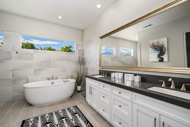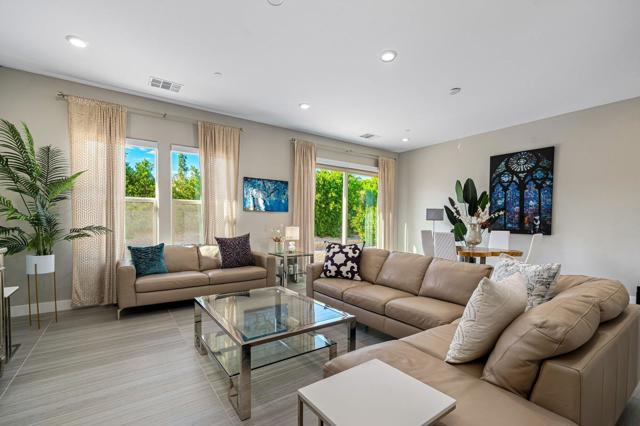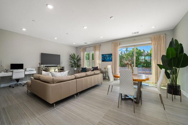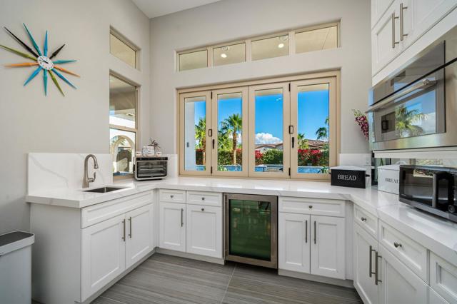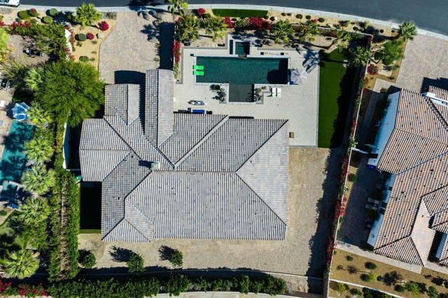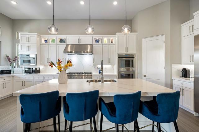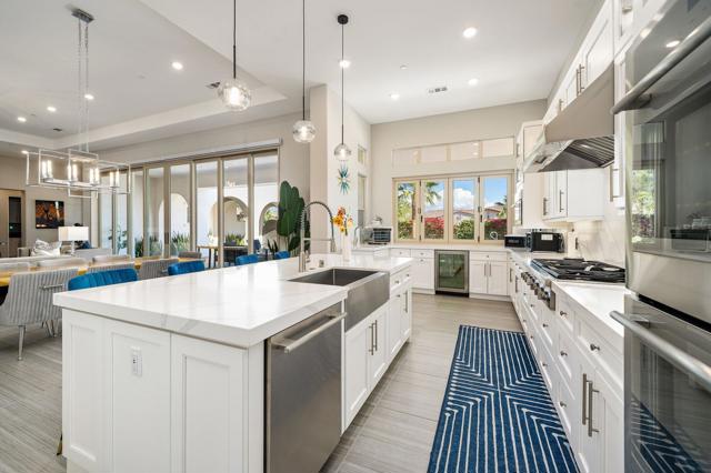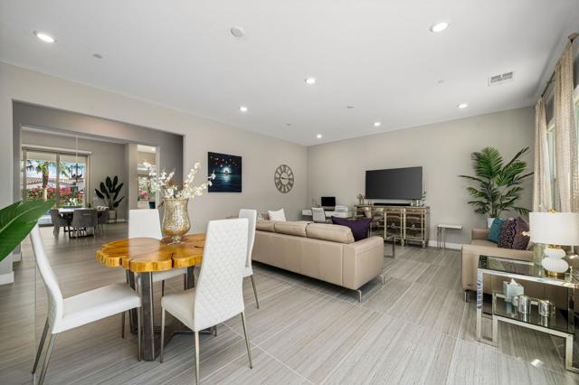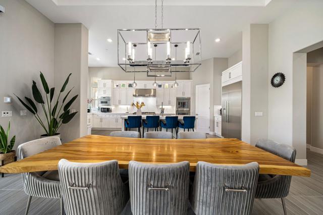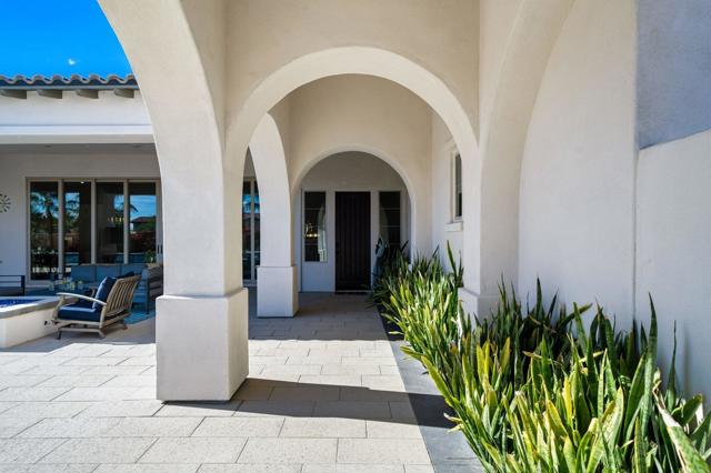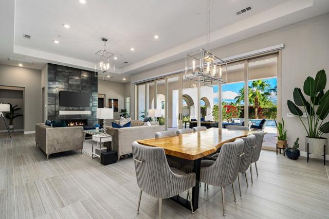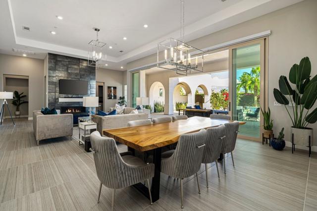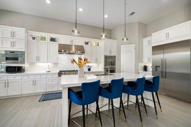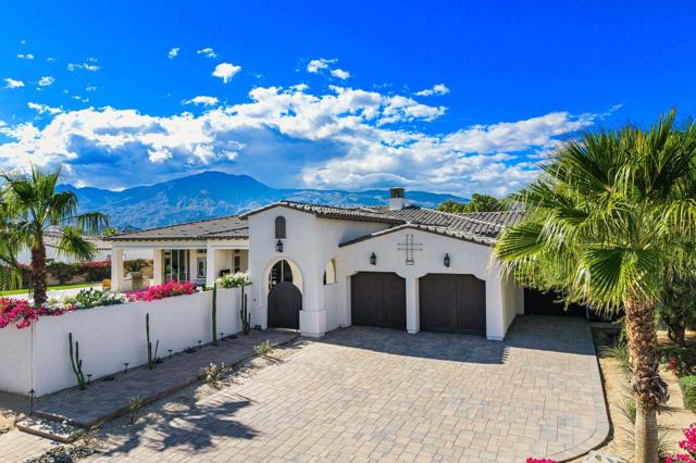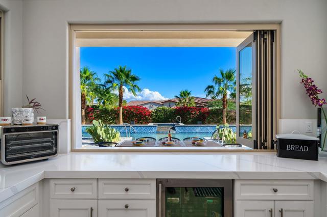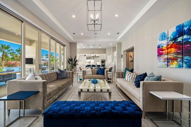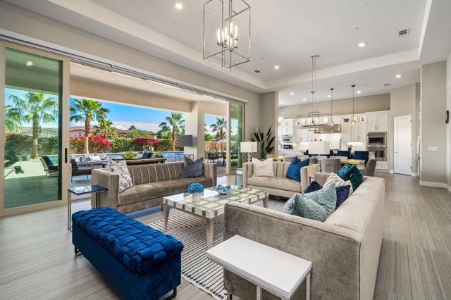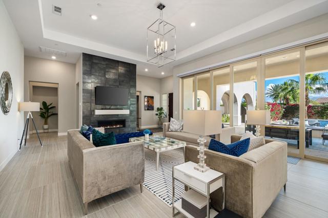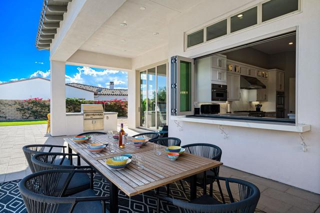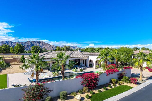 Welcome to Griffin Ranch--a premier, guard-gated community in La Quinta for those who expect nothing less than exceptional living. Perfectly positioned on a premium lot, this stunning and fabulously decorated estate is designed for seamless indoor-outdoor living and effortless entertaining, framed by panoramic mountain views and lush, maintenance-free landscaping. From the moment you arrive, the attention to detail is unmistakable--custom hardscaping, elegant pavers, and mature desert flora set the tone for the luxury lifestyle that awaits. Step outside into a resort-style backyard oasis curated for relaxation and recreation. Whether you're soaking in the sparkling saltwater pool with Baja shelf, unwinding in the spa, or enjoying the big game on the outdoor TV, every element is designed for comfort and entertainment. Grill poolside on the built-in BBQ, host unforgettable evenings around the firepit, or toast with friends at the bar beneath the covered patio--this home was built for moments that matter. And don't miss the spacious side yard, with great views, already prepped and waiting for the buyer to add their personal touch--be it a putting green, sand volleyball court, or whatever their imagination can dream up. Inside, expansive slide-away glass doors create a true indoor-outdoor experience, flowing from the elegant great room to the patio beyond. The professionally designed interior is light and airy, anchored by a chef's kitchen featuring premium stainless-steel appliances, double oven, built-in refrigerator, oversized island, walk-in pantry, and stylish Quartz finishes. The open-concept design continues with a wet bar and wine cooler--ideal for entertaining before a night out... or a night in.The primary suite is a tranquil retreat with a spa-inspired bath and generous walk-in closet. Three spacious guest bedrooms ensure visitors feel right at home, while a versatile bonus room easily flexes as an office, media room, or fifth bedroom. Every space has been elevated with custom lighting, and designer window treatments. A four-car garage offers generous space for vehicles, golf carts, and storage--an exceptional find in the desert. As a resident of Griffin Ranch, enjoy access to a state-of-the-art clubhouse featuring tennis & pickleball courts, Jr. Olympic-size pool, fitness and Pilates studios, billiards, bocce courts, BBQ pavilions, dog park, & putting green--an active, social lifestyle built right into the neighborhood.