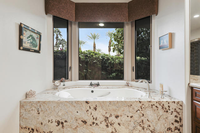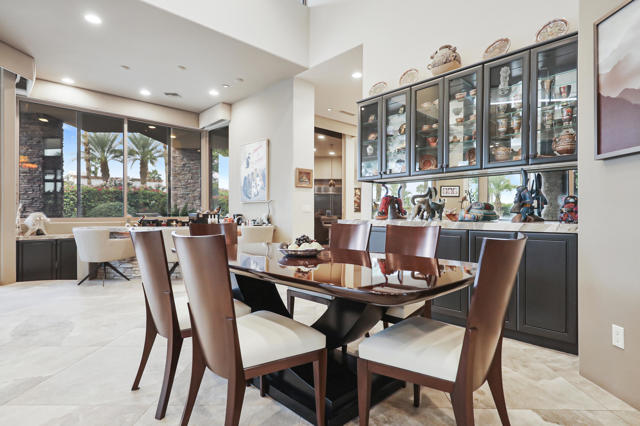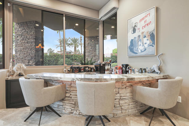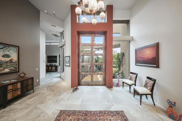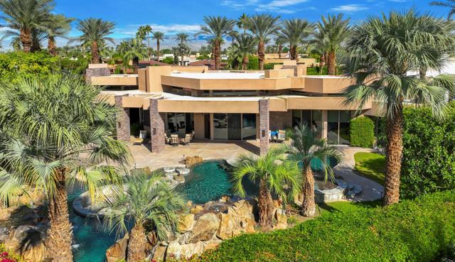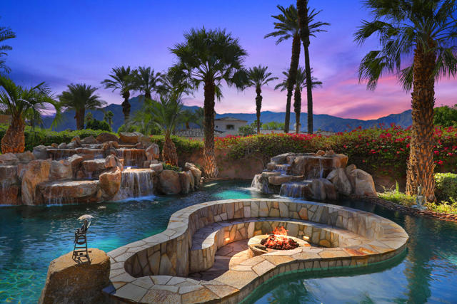 Architectural Masterpiece in The Estancias with mountain views. An exceptional, custom-designed residence by renowned Architect John Walling, was just listed in this prestigious community. Travel down a long circular private driveway and walk through the lush courtyard. Enter through the towering steel and glass entry doors to be instantly captivated by the spacious living room adorned with15 ft high ceilings, dramatic walls of glass and a commanding stacked-stone fireplace. There's an adjacent wet bar that's been updated in modern sophistication, with sleek contemporary cabinetry and stunning marble countertops with a large pass-through window to the patio. The chef's kitchen was also updated with gorgeous counter tops featuring waterfall edges, sleek cabinets and stainless appliances, plus, two large pantries. The private primary wing offers a sanctuary of peace complete with an adjoining executive office with views to the mountains and pool. There's a dedicated fitness studio, as well. The primary bathroom offers granite counter, spa tub, a large shower, and two separate water closets. All secondary bedrooms are large and luxurious, private en-suites. The private backyard is an entertainer's dream offering a lush, enclosed oasis featuring a resort-style pool with waterfalls, a large whirlpool spa, a unique island fire pit, all anchored by a spacious covered patio with a full outdoor grill/bar. Enjoy spectacular, unobstructed views of the majestic Santa Rosa Mountains. Completing this immaculate estate is a fully finished, upgraded garage with storage cabinets and convenient direct access to the kitchen. This is quintessential desert luxury, redefined.