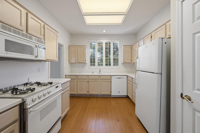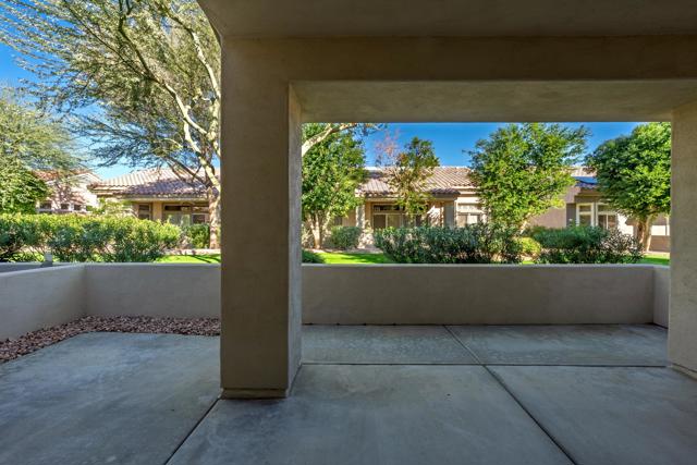 Sun City Palm Desert - Garnet. Ideally located in the heart of Sun City and just moments from both the Mountain View and Sunset View Clubhouses, this sought-after Garnet model offers low-maintenance living with HOA-maintained landscaping, roof, and stucco. The home features a spacious north-facing rear patio overlooking a lush greenbelt, plus a welcoming front courtyard that adds both charm and functionality. Inside, shutters are found throughout, and hardwood flooring extends through most of the home. The living room opens directly to the rear patio through a sliding glass door. The kitchen offers corian countertops and a convenient pantry. The primary suite includes a bay window and mirrored wardrobe closet, along with an ensuite bath featuring dual sinks and a glass-enclosed stall shower. A guest bedroom is served by a full bath with a tub/shower combination. The laundry room is located inside for added convenience. Additional highlights include a spacious two-car garage and a newer AC installed in 2019.
