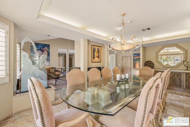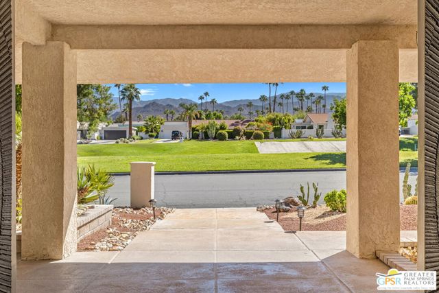 Opportunity meets lifestyle in this well-maintained 3 bed + Den/Executive Office, 3.5 bath residence in coveted South Palm Desert. Set on just over half an acre, this nearly 4,300 sq ft home offers generous indoor/outdoor living, multiple gathering spaces, and park-like grounds with dramatic mountain views. A formal entry welcomes you into sun-filled living and dining rooms, each with vaulted ceilings and a shared two-sided fireplace. Views, too! The adjacent kitchen, complete with a detached island, abundant storage, and seamless connection to casual dining and the large family room, creates an ideal hub for entertaining! The soaring ceilings, wet bar with Scotsman icemaker, and gas fireplace blend comfort and convenience. Step outside to a resort-style setting with a built-in barbecue and a sparkling pool and spa. Whether hosting intimate dinners or larger celebrations, this outdoor environment is designed for effortless enjoyment! A whole-home surround-sound system further elevates both interior and exterior living spaces. The Primary Ensuite is a retreat of its own, offering direct patio access, a large walk-in closet, and a spa-inspired bath with dual showerheads, oversized steam shower, jacuzzi tub, and private outdoor area. Two Junior Ensuites each provide their own bathroom, walk-in closet, and outdoor connection. Skylights in the hallways bring in natural light, while built-in cabinetry adds excellent storage. Additional highlights include a bonus room lined with cabinetry perfect as a craft room, hobby studio, or additional storage plus a separate south-facing Executive Office with built-ins. A spacious utility room connects to the 3-car garage. OWNED SOLAR adds substantial energy efficiency and long-term savings. Located minutes from the best of South Palm Desert and El Paseo, the property also offers ample room to add an ADU.
