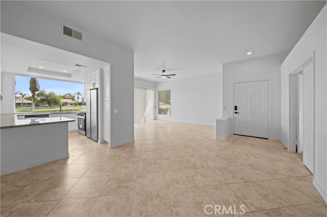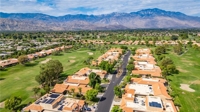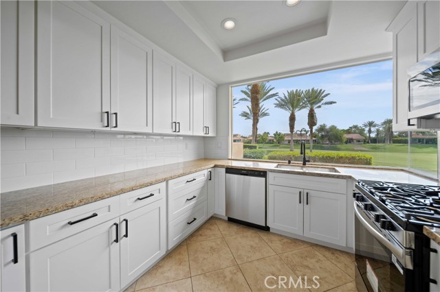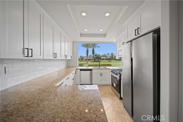 Luxury living behind the gates of the Mission Hills Country Club! This wonderful Deane Home features a scenic view overlooking the 4th Fairway of the Pete Dye Golf Course and it has been extensively upgraded! These upgrades include new interior paint, new carpeting, new kitchen & bathroom cabinets, new kitchen & bathroom granite counters, upgraded subway tile in the kitchen, new stainless appliances, new light fixtures, new plumbing fixtures, and much more. The bathrooms feature beautiful custom tile surrounds, and attractive tile flooring covers most of the home. The floorplan is bright and light, with large windows overlooking the view. It has an open living room, spacious primary suite, brand new kitchen with ample cabinetry, in-unit laundry (with washer/dryer machines included!), and 2 additional bedrooms. One of the bedrooms is versatile, with a double door entry and a sliding door to the exterior that make it a possible den, home office, or guest bedroom. There is a private gated courtyard area at the front of the home and a large patio area at the rear of the home, providing multiple areas for outdoor living. This home is situated on a nice street with an east-facing interior lot, and it has an attached 2 car garage. Mission Hills Country Club is a renowned private club (membership is sold separately) with numerous amenities such as championship golf, tennis, pickleball, gym, pools, spa, restaurant, social events, and much more. The HOA (dues are paid by the owner) covers amenities such as exterior maintenance, landscaping, community pools/spas, trash service, cable TV, and internet service. This home is also walking distance to the Westin Hotel, and many of its amenities can be utilized by Mission Hills residents. This is an excellent opportunity for luxury living in Mission Hills at an affordable price. This home has been beautifully upgraded, it has a great view, and it's ready for immediate enjoyment. Don't miss out!