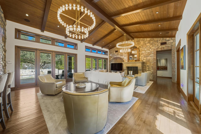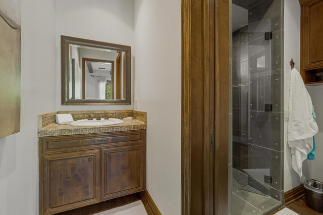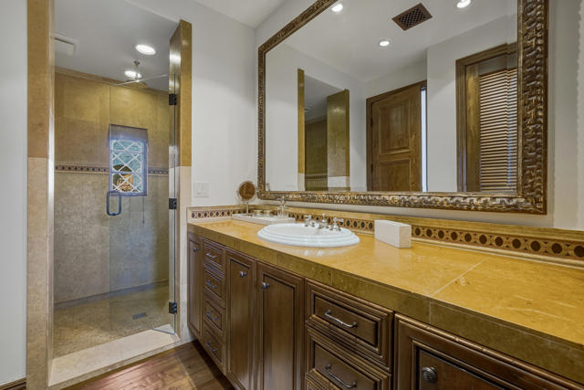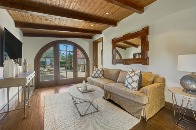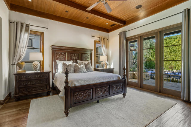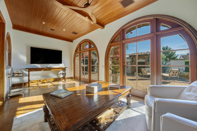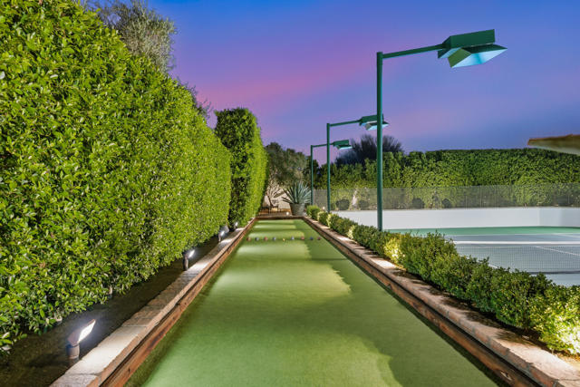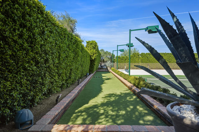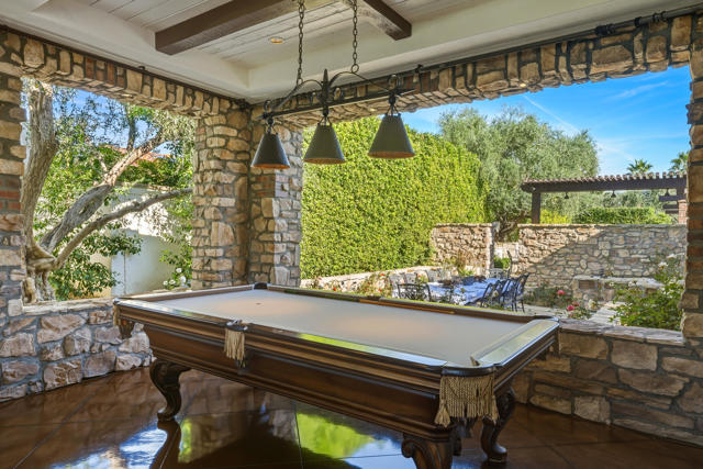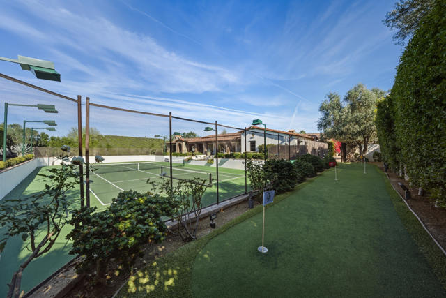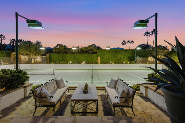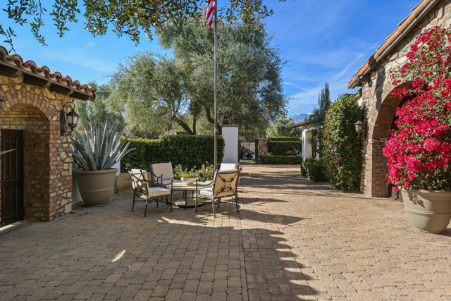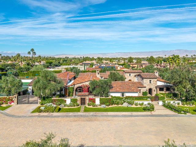 Experience luxurious desert living in an iconic private compound double-gated within the exclusive enclave of Bella Clancy. Designed for those who value architecture, privacy, quality and effortless indoor-outdoor living, this 6,275sf residence delivers richly appointed living space along with an additional 1,200sf of covered outdoor living designed for entertaining, relaxation, and timeless elegance. The interiors embrace classic warmth--arched lines, rich textures, and generous proportions. The great room flows effortlessly into the inviting chef's kitchen and formal dining area creating a welcoming atmosphere ideal for intimate gatherings or large celebrations. The main home has three spacious ensuite bedrooms plus an office with sitting area and powder bath, while the detached guest casita, complete with its own bar, sitting room, full bathroom and powder bath, offers the charm of a private bungalow. A one-of-a-kind fitness room and spa offers a personal sanctuary for rejuvenation and self-care. At the heart of the home lies an oversized central courtyard, reminiscent of old-world villas. A graceful water feature, warm string lighting, and a wood-or-gas-burning fireplace set a romantic tone for evenings under the desert sky. Surrounding living spaces open naturally to this courtyard, blending indoor and outdoor living. With 2 combined lots equally almost 1 acre of land, the estate's outdoor amenities create a private resort experience. The covered pavilion houses a bar complete with sink, dishwasher, storage, counter seating and TV, a game area with a pool table and a living room with a wood burning fireplace. A sunken dining area offers an unforgettable setting for dinners beneath the stars. The pool and spa with cascading waterfall deliver relaxation amid sweeping mountain views, while the five-hole putting green and bocce ball court add an element of classic leisure. For recreation on a grand scale, the property features a freshly surfaced sunken, fully lit tennis court, also striped for two pickleball courts, allowing for day-to-night play in complete privacy. Luxurious, secluded and masterfully designed, 4 Via Lantico stands as one of Rancho Mirage's most remarkable estates--where Mediterranean character and desert serenity create an unmatched lifestyle.