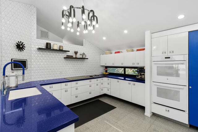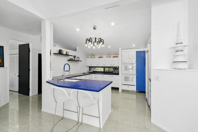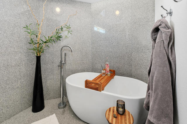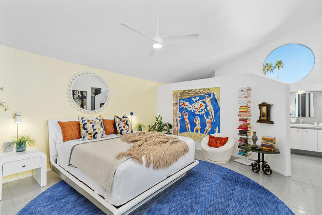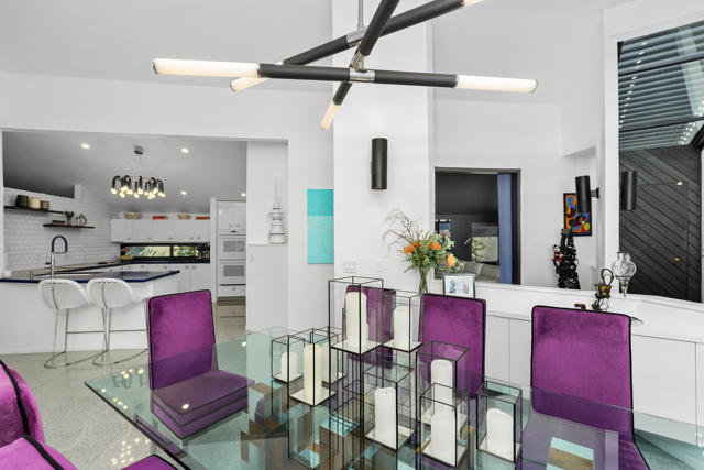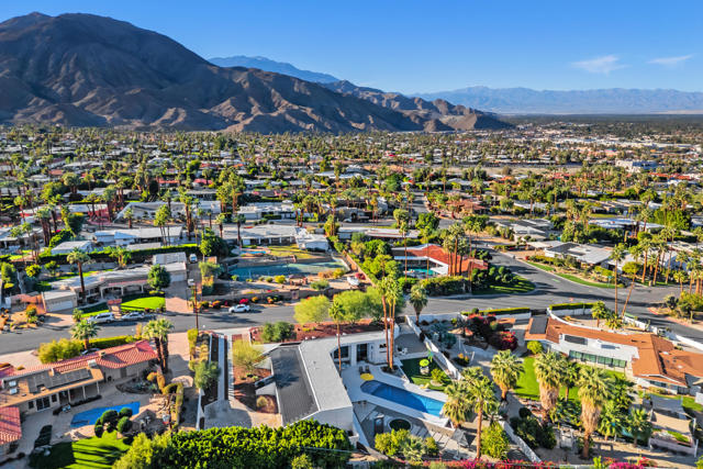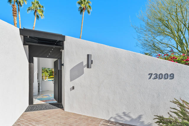 Discover a rare architectural retreat by noted architect Charles L. Martin, offering privacy, panoramic mountain views, and exceptional efficiency just moments from El Paseo. Set on a nearly half an acre lot, this historically significant 2-bedroom, 3-bath home with den/TV room and bonus room with Murphy bed lives as a refined yet playful desert escape. Dramatic ceilings and custom window geometry flood the interiors with natural light while maintaining comfort from morning through evening. Major upgrades respect the home's mid-century modern character, including new Fleetwood sliders, dual-pane low-e windows, and a louvered entry skylight, along with a freshly repainted exterior. A standout feature is the Tesla Solar Roof with two Powerwall batteries, delivering substantial energy savings and dependable backup power, a true advantage in the desert climate. Outdoors, a saltwater pool and spa with both heating and cooling anchor a secluded oasis framed by mature landscaping and a citrus grove. Inside, the updated kitchen features new counters, backsplash, sink, fixtures, lighting, and a Thermador induction cooktop. The media room is designed for immersive viewing with a 100'' LG laser projector, motorized screen, and 8-speaker Dolby Atmos sound. The spacious primary suite offers a walk-in closet, double vanities, and a spa-like wet room with large walk-in shower and soaking tub. Guests enjoy a private suite of their own, while the versatile bonus room with Murphy bed and storage flexes easily as guest quarters, fitness area, or studio. Practical amenities include an extended driveway with generous parking, two-car garage plus golf cart/RV parking, and light-touch smart-home features: automated shades, app-controlled pool system, and integrated climate and security. With no HOA and a premier South Palm Desert location, this exceptional property blends timeless design, energy-smart innovation, and true privacy for effortless desert living.
