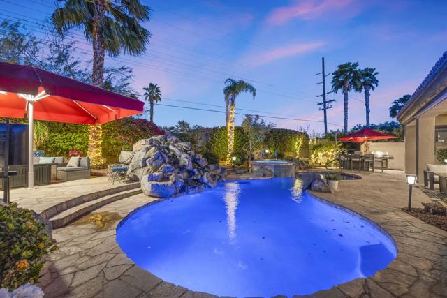 Welcome to 47410 Via Florence-- *OFFERED PARTIALLY FURNISHED*a beautifully upgraded former model home in the coveted guard-gated community of Lake La Quinta. Offering 3 bedrooms, 3 bathrooms, and 2,468 sq. ft. of thoughtfully curated living space, this residence blends high-end comfort with effortless desert style. From the moment you arrive, the curb appeal sets the tone: a paver driveway, custom landscape lighting, a gated front courtyard, and a welcoming patio create an inviting first impression. Inside, soaring ceilings, modern designer paint tones, and tile flooring throughout provide a refined backdrop for everyday living. The open-concept great room is anchored by a dramatic stone-accented fireplace and complemented by a built-in wet bar--an ideal setting for both entertaining and relaxation. Carefully selected designer light fixtures warm the home and elevate each space with character and style. The updated chef's kitchen is a true highlight, featuring quartz countertops, a sleek glass tile backsplash, black stainless steel appliances including a double oven, and abundant prep and storage space. The primary suite overlooks the serene backyard and offers wood-look tile flooring, a spa-inspired bathroom with an oversized soaking tub, custom tile shower, dual vanities with tile backsplash, and two generous walk-in closets. The versatile front guest bedroom functions seamlessly as a home office, complete with a built-in desk, Murphy bed, and private en-suite bathroom. A third en-suite bedroom ensures guests enjoy their own comfortable and private retreat. Step outside to your own private oasis. The backyard features a shimmering saltwater Pebble Tec pool and spa with a dramatic cascading waterfall, misters, roll-up shades, flagstone decking, and multiple lounging and dining zones shaded by custom umbrellas. Whether enjoying quiet mornings by the pool or entertaining beneath the desert stars, this outdoor haven delivers a resort-caliber experience. Additional features include an epoxy-coated garage with a mini split and ample storage. Within Lake La Quinta, residents enjoy exclusive access to a private 25-acre lake for electric boating, kayaking, and catch-and-release fishing, along with a 3-acre community park with a pool, tennis and pickleball courts, a BBQ area, and more. A lifestyle of comfort, serenity, and resort living awaits--this exceptional home will not last. Contact the listing agent for a private showing today.