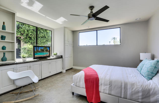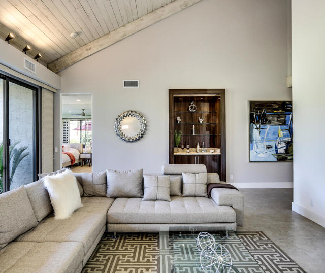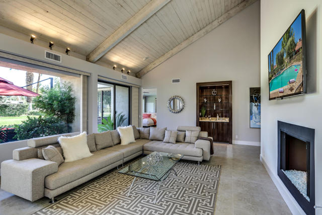 Discover this luxurious, remodeled, spacious condo, nestled in the serene beauty of Mission Hills. Glass walls open to expansive views of the patio, greenbelt, pool, and the lake beyond, enhanced by vaulted ceilings and stunning tiled floors. The kitchen as well as both bathrooms have been tastefully re-envisioned. Two generous guest bedrooms offer privacy, while still flowing efficiently in the layout. The oversized primary bedroom seamlessly connects to the outdoors. Modern fixtures tastefully adorn this condo, creating a sophisticated ambiance with ample closet and storage space. Convenience meets style with a large double garage, golf cart garage, and adjacent storage room. Explore the vibrant Mission Hills community, surrounded by breathtaking mountain views and world-class amenities. Enjoy 54 golf holes, 59 tennis and pickle-ball courts, croquet courses, a gym, and a rejuvenating spa. The remodeled Clubhouse offers fine spirits, casual and fine dining options, serving as a perfect social hub. Seize the opportunity to make this haven your home, where luxury harmonizes with the country club lifestyle.