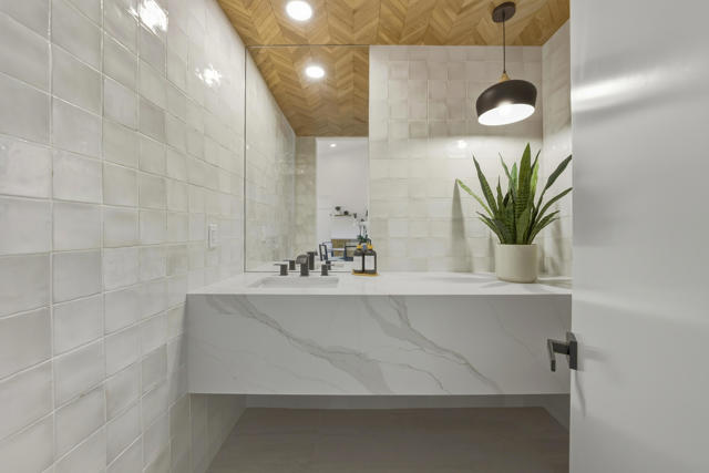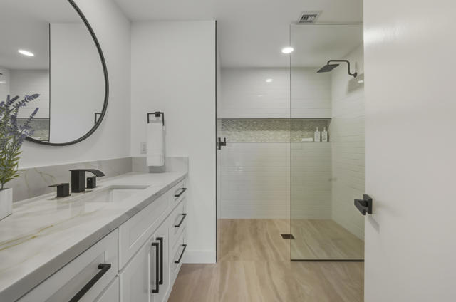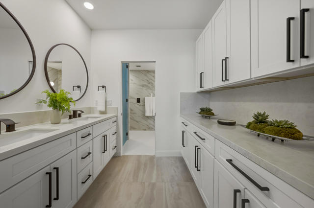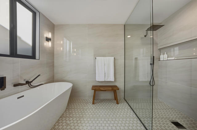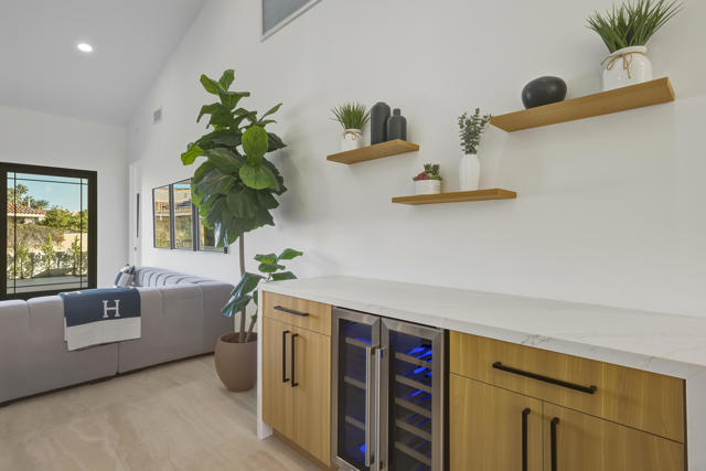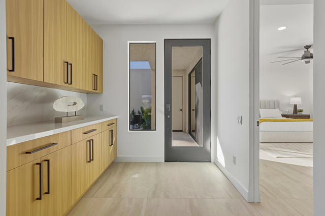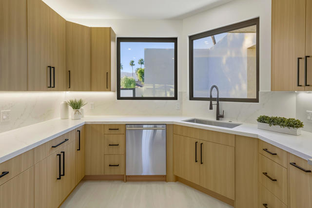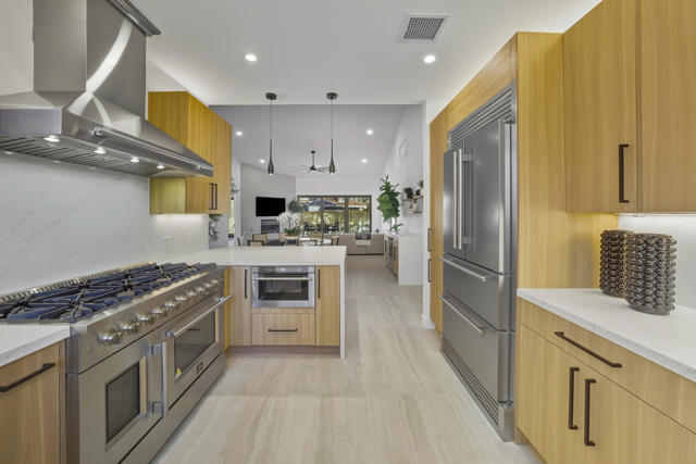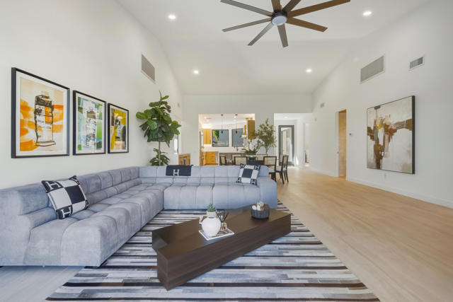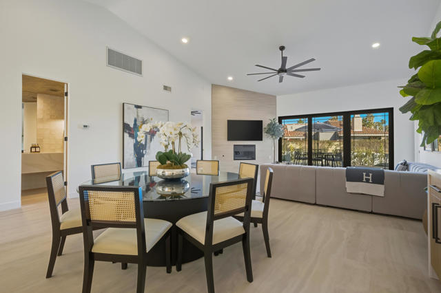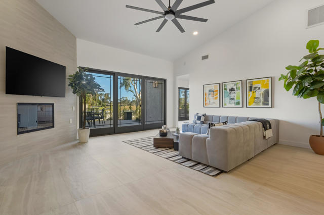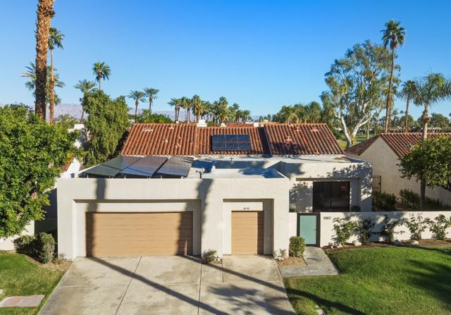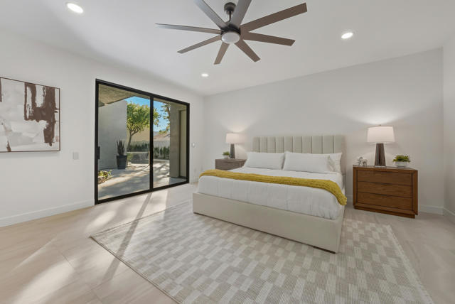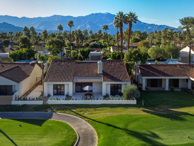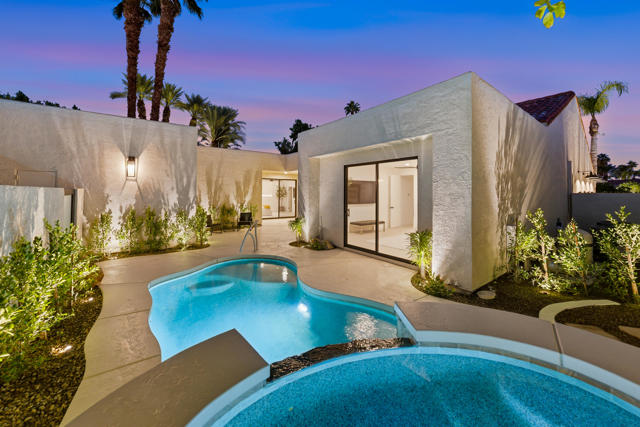 Located behind the guard gates of Mission Hills Country Club this extraordinary, fully transformed modern retreat offers 3,075 square feet of elevated indoor-outdoor living. This rare detached residence features 4 private bedroom suites and 4.5 baths, each designed like an individual hotel bungalow with refined finishes, calming ambiance, and luxurious comfort. A private gated courtyard sets the stage with a refreshing pool, an elevated spa, and a cascading waterfall that immediately creates a sense of serenity. Inside, the oversized great room impresses with dramatic volume ceilings, a sleek fully tiled fireplace and a newly designed wine bar ideal for entertaining. The kitchen is a showcase of natural wood cabinetry paired with European-inspired, commercial grade stainless steel appliances, blending warmth and modernity with exceptional functionality. The renovation extends far beyond aesthetics. Every detail has been carefully considered, including significant energy-efficient upgrades such as new heating and air-conditioning systems including ductwork, a variable-speed pool pump, and for added savings, a low-cost leased solar system. Updated LED lighting, designer flooring, custom window treatments including a motorized shade in the great room and meticulously crafted cabinetry further enhance the home's refined character. The rear yard is an entertainer's dream, featuring a tile patio that captures unbelievable panoramic views of the Arnold Palmer Private Course's 13th tee box, framed by sweeping mountain views, shimmering lake and golf vistas. Perfectly positioned sliding doors open to this incredible backdrop, inviting natural light and seamless indoor-outdoor living. The side yard unveils a unique highlight--your own private bocce ball court--offering endless enjoyment for gatherings and weekend fun. The land lease has been extended to 2121 and is one of the few properties in Mission Hills that does not require BIA approval for transfer. The 2-Car and Golf cart garage have new epoxy floors and electric car charger. Plus, this designer finished home includes all furnishings, TV's, accessories and artwork. Whether hosting guests, savoring peaceful mornings overlooking the fairway, or soaking in the cinematic sunsets, this home delivers a resort-level experience with the comfort of modern efficiency. A rare offering in one of Rancho Mirage's most coveted communities.