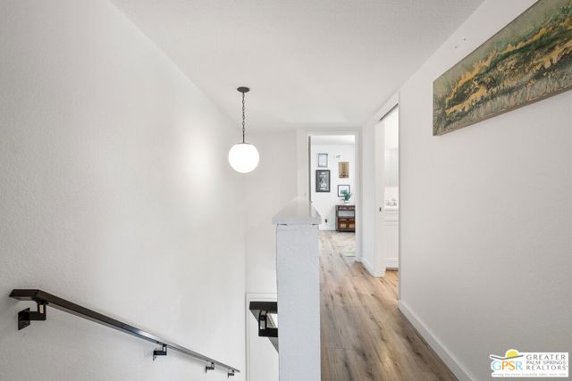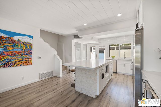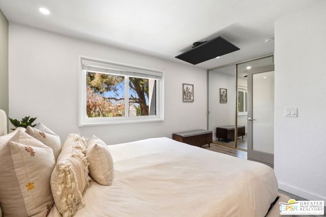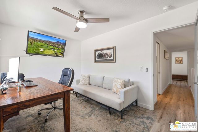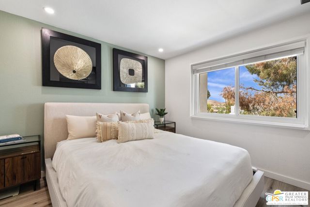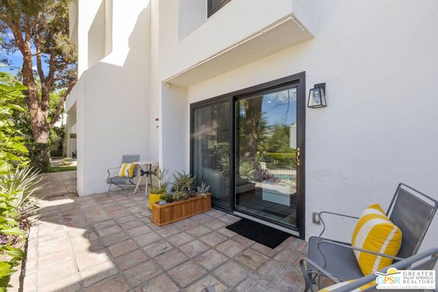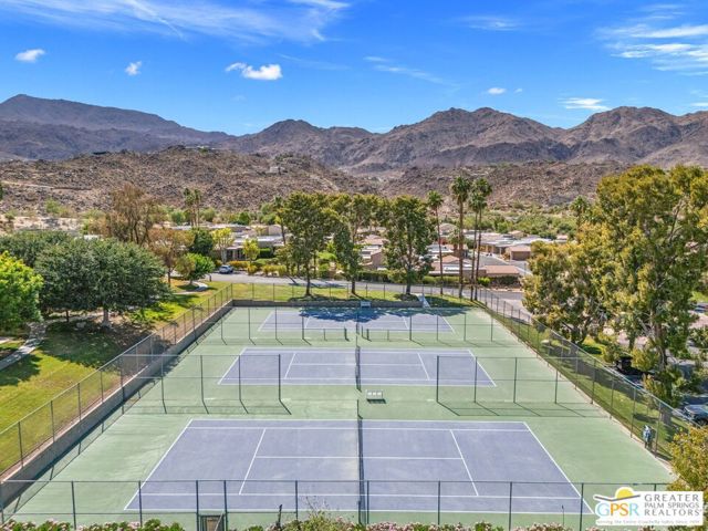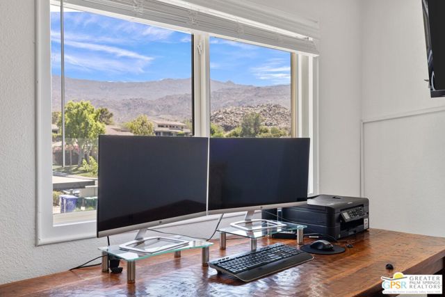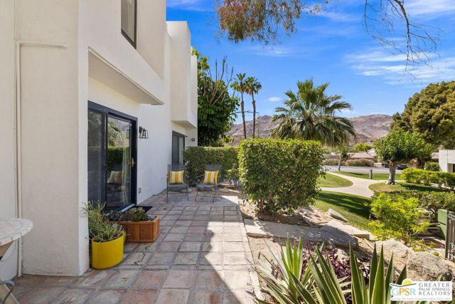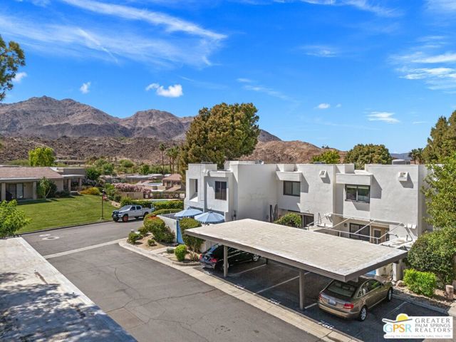 Perfectly Positioned, Updated, and Move-In Ready! This light-filled two-story townhome offers modern style, effortless indoor-outdoor living, and stunning mountain and pool views. Perched just right above the pool, it strikes the ideal balance of privacy and connection with a private path to the pool! The open-concept main level showcases a reimagined kitchen with an oversized island, designer finishes, and seamless flow into the living and dining areas. A gated front courtyard with a fun pass-through to the kitchen adds charm and functionality. Also on the main level are a powder bath and large under-stair storage closet. Upstairs, the updated primary suite features a modern bath and a ceiling-mounted TV that retracts when not in use. A newer laundry area adds convenience to the second level. The guest bedroom, currently used as an office, is located at the opposite end and includes a fully updated bath, offering ideal bedroom separation. Additional highlights include two assigned covered carports, a rare feature in the 120-home Mountainback community. Amenities include tennis, pickleball, pools, + spa. Just minutes from El Paseo's premier shopping and dining, and close to scenic hiking trails. Low HOA fees. Take the Matterport Virtual Tour to experience the layout and lifestyle this special property offers. Welcome to easy, elevated living in South Palm Desert.