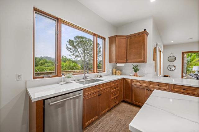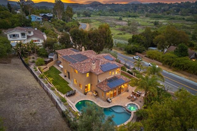 From the moment you arrive at this custom West Olivenhain estate—perched above the San Elijo River Valley—you’ll feel the presence and charm of a truly special home. The extended paver driveway and lush tropical landscaping lead you away from the hustle and bustle and into your own private coastal retreat. Spend your days floating in the saltwater pool, unwinding in the spa, or entertaining friends and family with seamless indoor/outdoor living. As evening falls, curl up beside the outdoor fireplace under glowing bistro lights and let every moment feel like a vacation at home. Inside, natural light floods through wood-cased windows and soaring ceilings, showcasing custom craftsmanship at every turn. The front living room features stunning arched windows that frame the tropical landscape, while a reimagined fireplace clad in El Dorado White Elm stone creates the perfect spot to relax with conversation or a quiet cup of coffee. Continue through the formal dining area—also opening to the rear yard—and into the heart of the home: a spacious great room that flows effortlessly outdoors through multiple sets of doors, creating a true entertainer’s dream. The remodeled kitchen anchors the space with stainless steel appliances, a gas range with statement hood, custom cabinetry, Opulence Quartz countertops, a walk-in pantry, and a cozy breakfast nook. The adjoining family room, complete with a second fireplace, overlooks the lush backyard oasis. Step outside and be transported to your favorite tropical destination. The resort-style yard showcases a saltwater Pebble Tec pool and spa, custom stone fireplace, built-in BBQ island, terraced gardens, and paver walkways—all illuminated by upgraded solar-powered landscape lighting. With owned solar for both the home and pool, energy efficiency meets luxury. Upstairs, the spacious primary suite feels like a private retreat with custom wood shutters, wood-cased windows, a balcony overlooking the preserve, an oversized walk-in closet, and a spa-inspired bath with dual sinks and a steam shower. Additional upstairs highlights include a junior suite, two secondary bedrooms with a shared bath, and a large fifth en-suite bedroom with a private entrance—ideal for a guest suite, ADU, office, or studio. Additional features include a three-car garage with custom wood doors, epoxy flooring, and built-in cabinetry, as well as storage sheds, a tile roof, solid wood interior doors, 3-zone AC, surround sound, and more. This is a rare opportunity to own a one-of-a-kind luxury estate in one of Encinitas’ most sought-after communities.