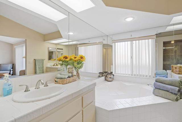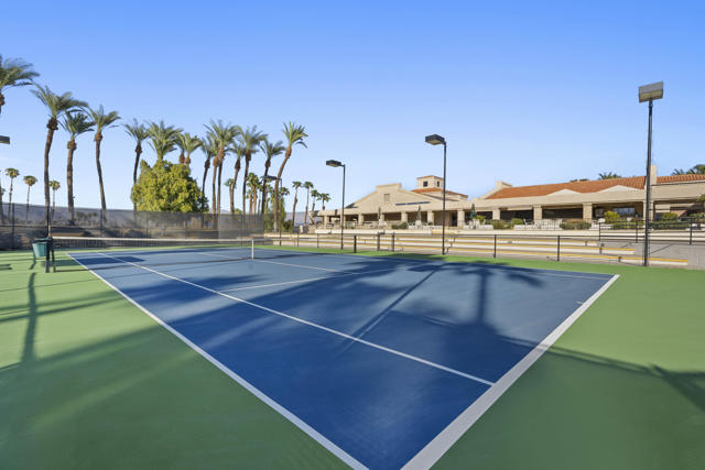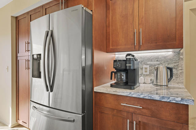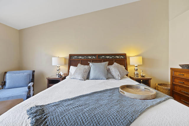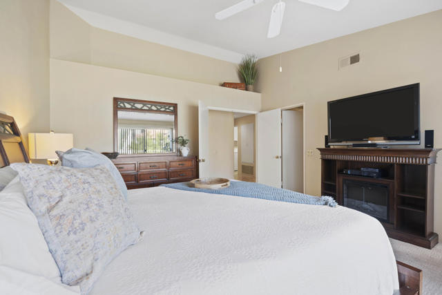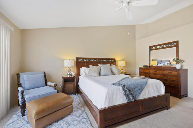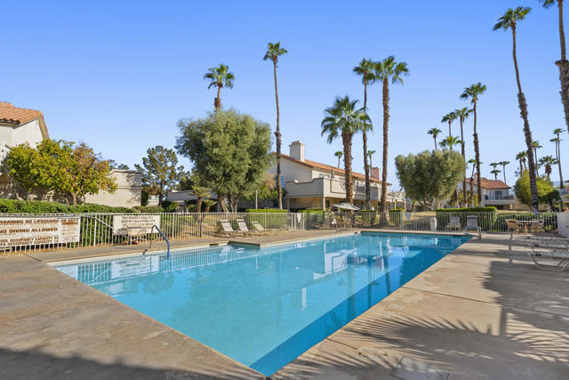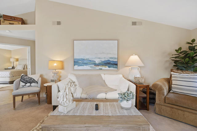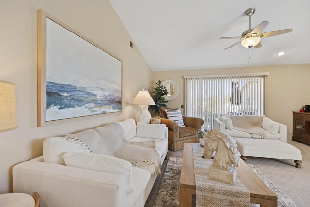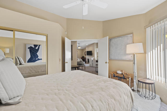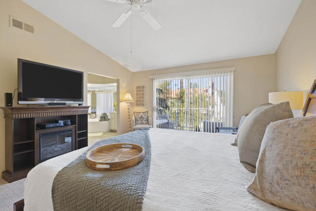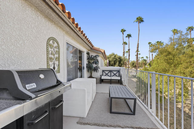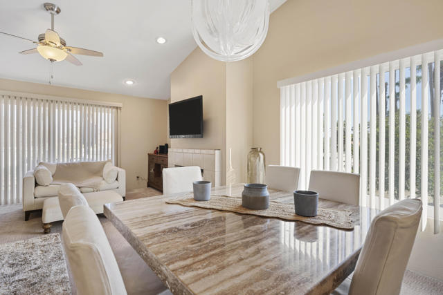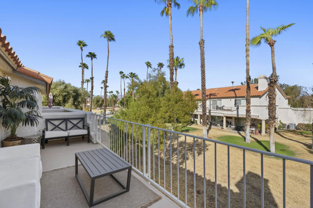Nestled within Desert Falls Country Club, this top-floor 3-bedroom, 2.5-bath villa is offered fully furnished with decor, bedding, and kitchen essentials, delivering effortless comfort and resort-style living in the heart of Palm Desert. Soaring ceilings create a spacious, open ambiance throughout the main living areas. The updated kitchen features granite countertops, stainless steel appliances, under-cabinet lighting, and a passthrough window into the light-filled living room with a cozy fireplace. Just off the kitchen, a charming breakfast nook offers the perfect spot for morning coffee or casual meals. The primary suite feels airy and serene with vaulted ceilings and direct access to a private balcony. A custom walk-in closet provides generous storage, while the en suite bath includes dual vanities, a soaking tub, walk-in shower, and private water closet. A second en suite bedroom ensures comfort for guests, and a third bedroom adds flexibility as an office or creative space. Two private balconies invite you to unwind under the sun or take in vibrant desert sunsets. Whether you're entertaining after a round of golf or relaxing in solitude, the indoor-outdoor flow is effortless. Community amenities include 32 sparkling pools and spas, tennis courts, a fitness center, clubhouse with bar, and a championship 18-hole golf course, all set against dramatic mountain backdrops. A two-car garage and a pool just steps away complete the package.