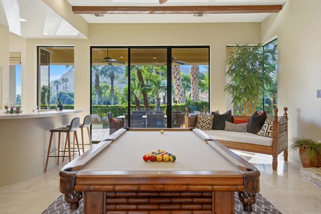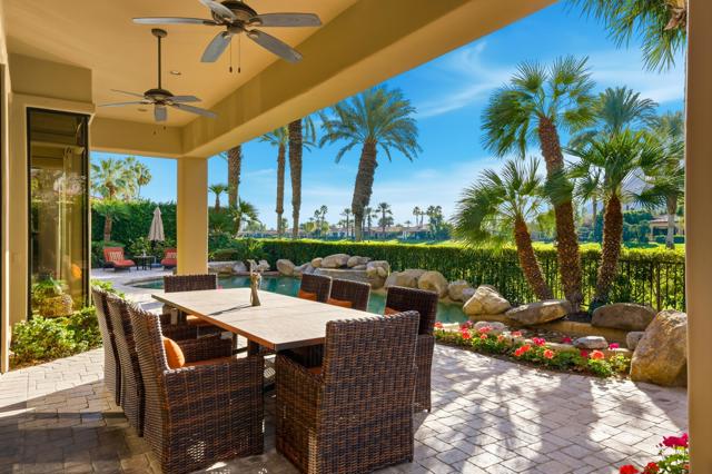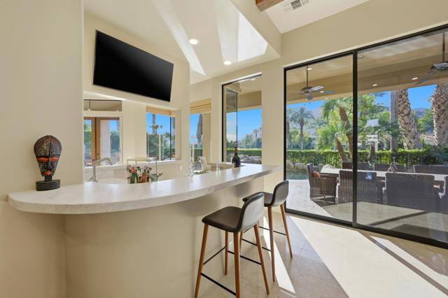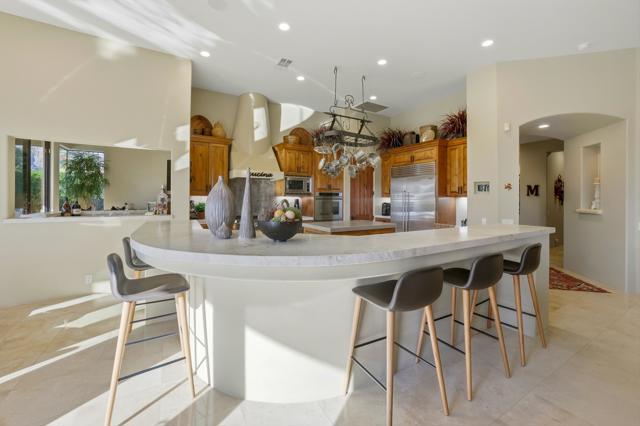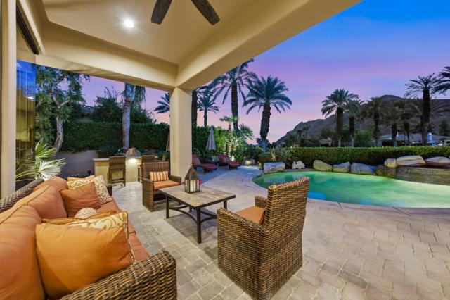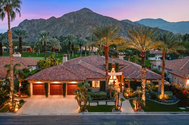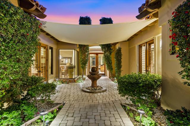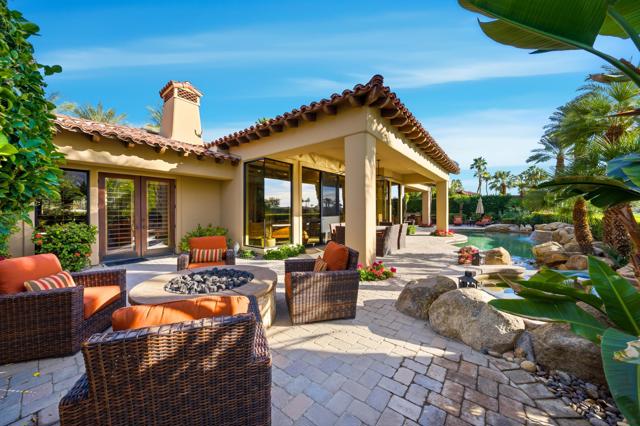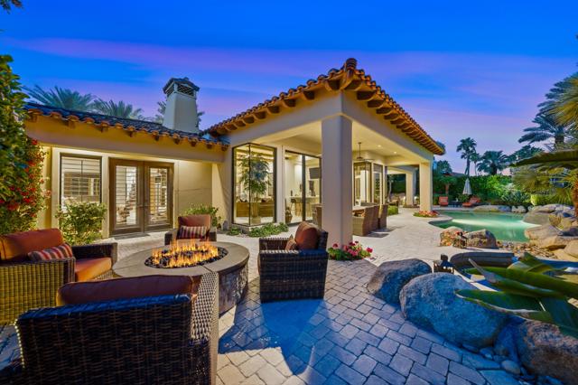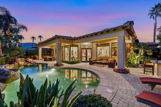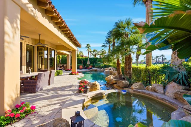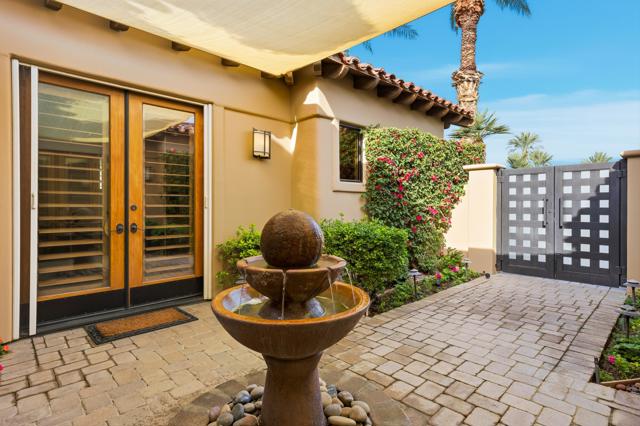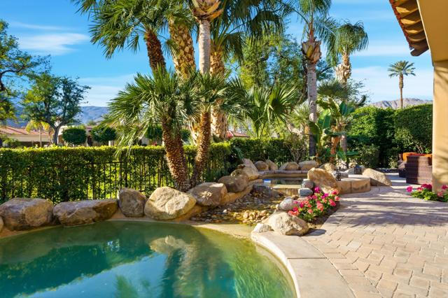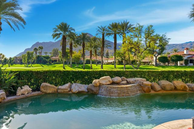 Where Elegance Meets Uncompromising Quality. Nestled on the 4th hole of the prestigious Citrus Golf Course, this exquisite home exemplifies refined luxury at its finest. With sweeping views of the lush green, the Santa Rosa Mountain and impeccable design throughout, every corner of this residence exudes sophistication and comfort.As you enter, the graceful fountain in the courtyard sets the tone for what lies within -- a seamless blend of traditional style and unparalleled craftsmanship. Upon stepping inside, a welcoming game room leads the way to an elegantly appointed wet bar, perfect for entertaining. The recently renovated kitchen boasts top-tier appliances, natural quartz countertops, custom wood cabinetry, and other high-end finishes that elevate the space to a culinary haven.The expansive great room opens up to a truly spectacular outdoor retreat. From the built-in BBQ and gas firepit to the resort-style pool complete with a spa and waterfall, this backyard oasis offers both relaxation and entertainment in equal measure. For those who appreciate the finer things, a private Jacuzzi, positioned perfectly for golf and tennis enthusiasts, adds an extra touch of luxury.Pet owners will find the meticulously landscaped grounds, featuring a sidewalk with two removable patches of artificial turf and a doggy door. The home is also fully enclosed, ensuring both privacy and security.The spacious primary suite offers a serene escape with direct access to the backyard, dual large walk-in closets, and a layout that ensures total privacy for its occupants. Two generously sized guest rooms, each with en-suite bathrooms, offer the utmost comfort and privacy for visitors. Additionally, the charming casita with a kitchenette and full en-suite bathroom provides an ideal retreat for family or guests.The oversized three-car garage, complete with an epoxy-coated floor and extensive storage cabinets, offers ample space for both vehicles and personal belongings.Turnkey furnished and move-in ready, this home presents a rare opportunity to experience the ultimate in luxury living.